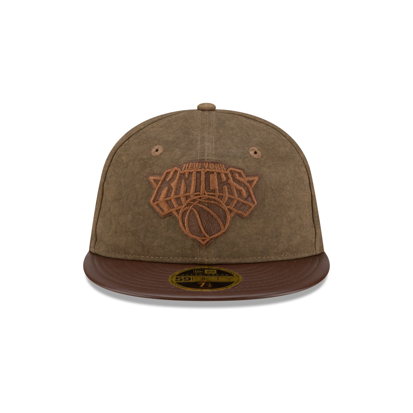 The New York Knicks Utility Linen Retro Crown 59FIFTY Fitted Cap features an embroidered Knicks logo at the front panels with a team patch at the right-wear side. Additional details include a faux leather visor and the NBA Logoman at the rear.