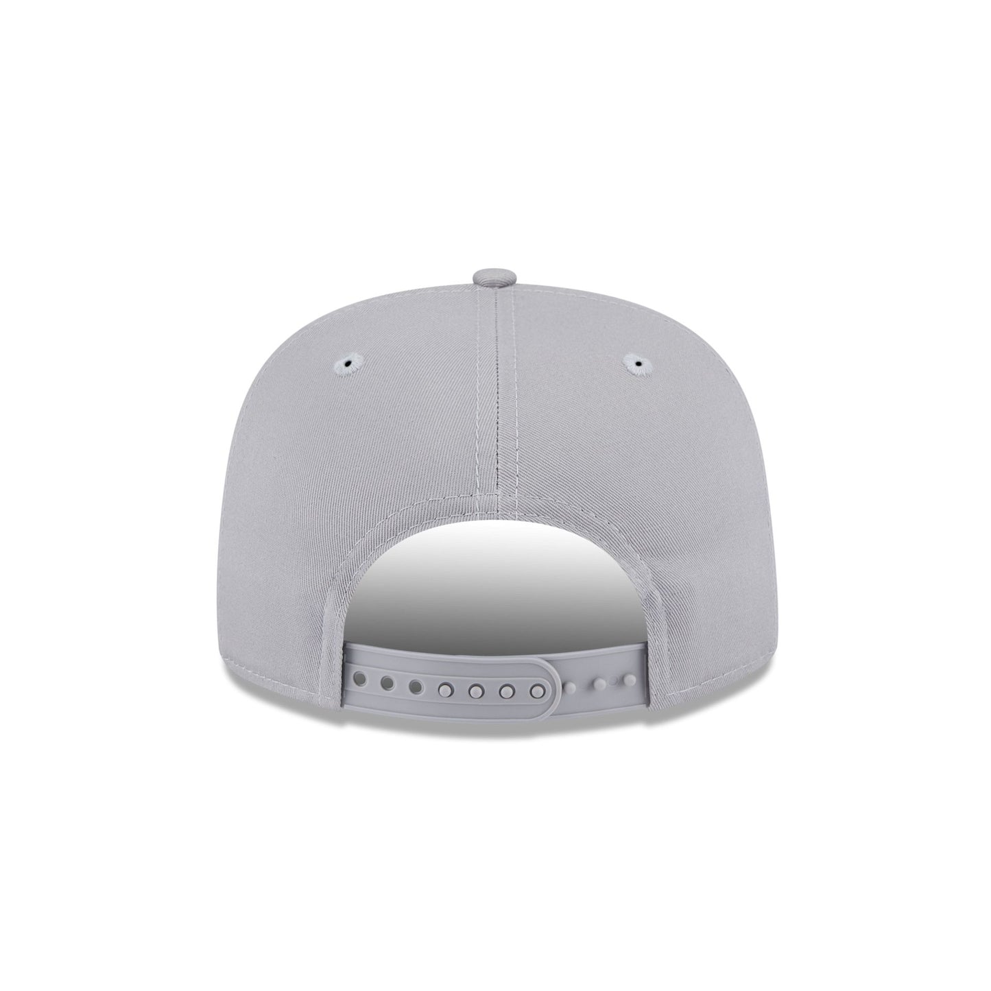 The New York Knicks Vintage Gray Golfer features an embroidered "PROPERTY OF" Knicks wordmark at the front panels with a team logo at the right-wear side and a rope at the visor. Additional details include a snapback closure at the rear and a green undervisor.