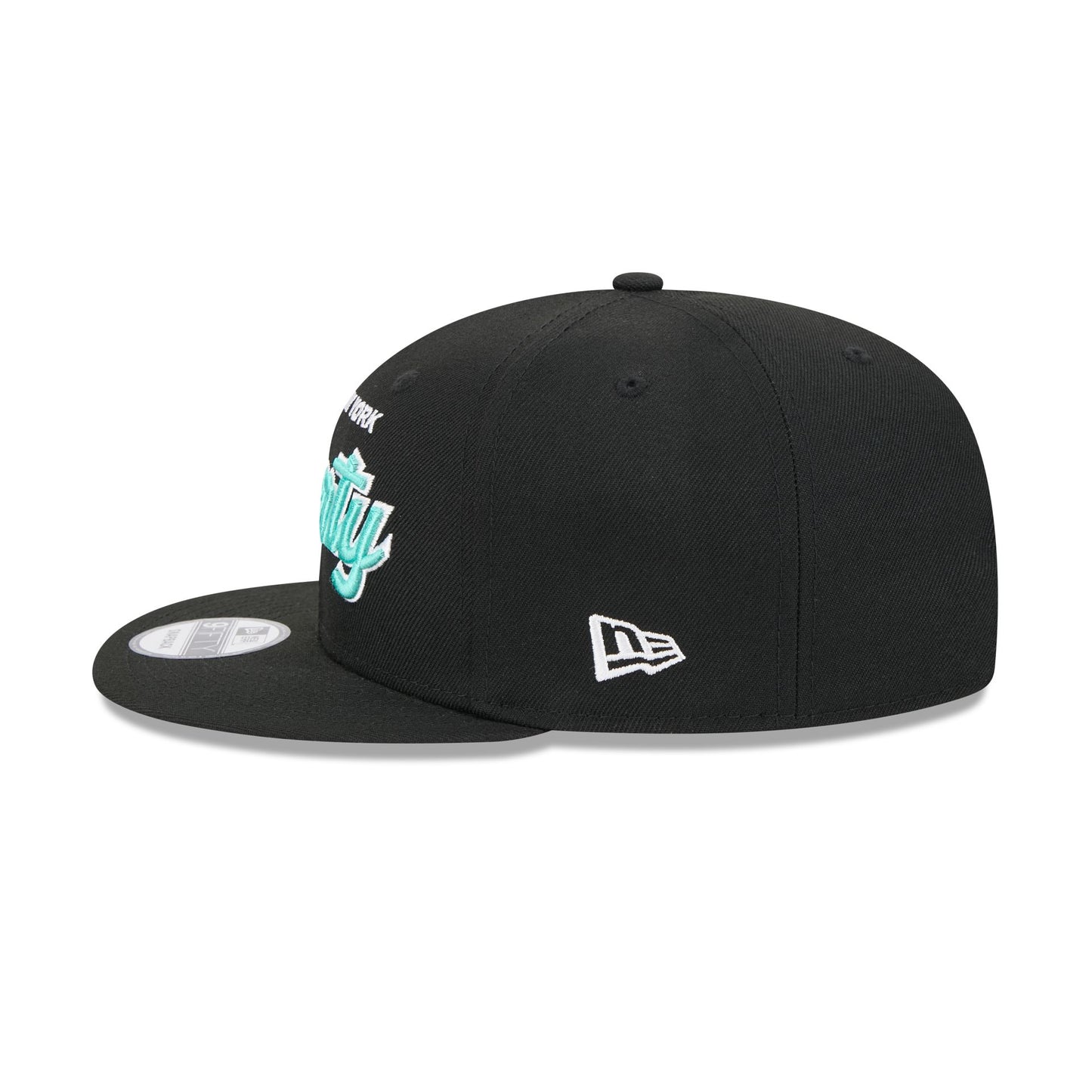 The New York Liberty Script 9FIFTY Snapback Hat features an embroidered Liberty wordmark at the front panels with a matching team logo at the right-wear side. Additional details include and a snapback closure at the rear and a gray undervisor.
