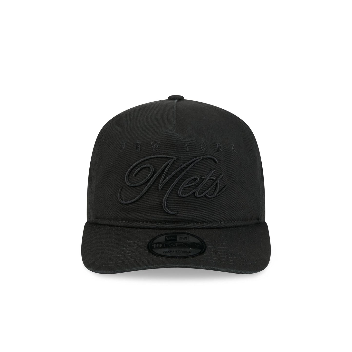 The New York Mets All Black Scripted 19TWENTY Adjustable Cap features an embroidered Mets all black script wordmark at the front panels with a matching team logo at the right-wear side. Additional details include an adjustable snapback closure at the rear and a gray undervisor.