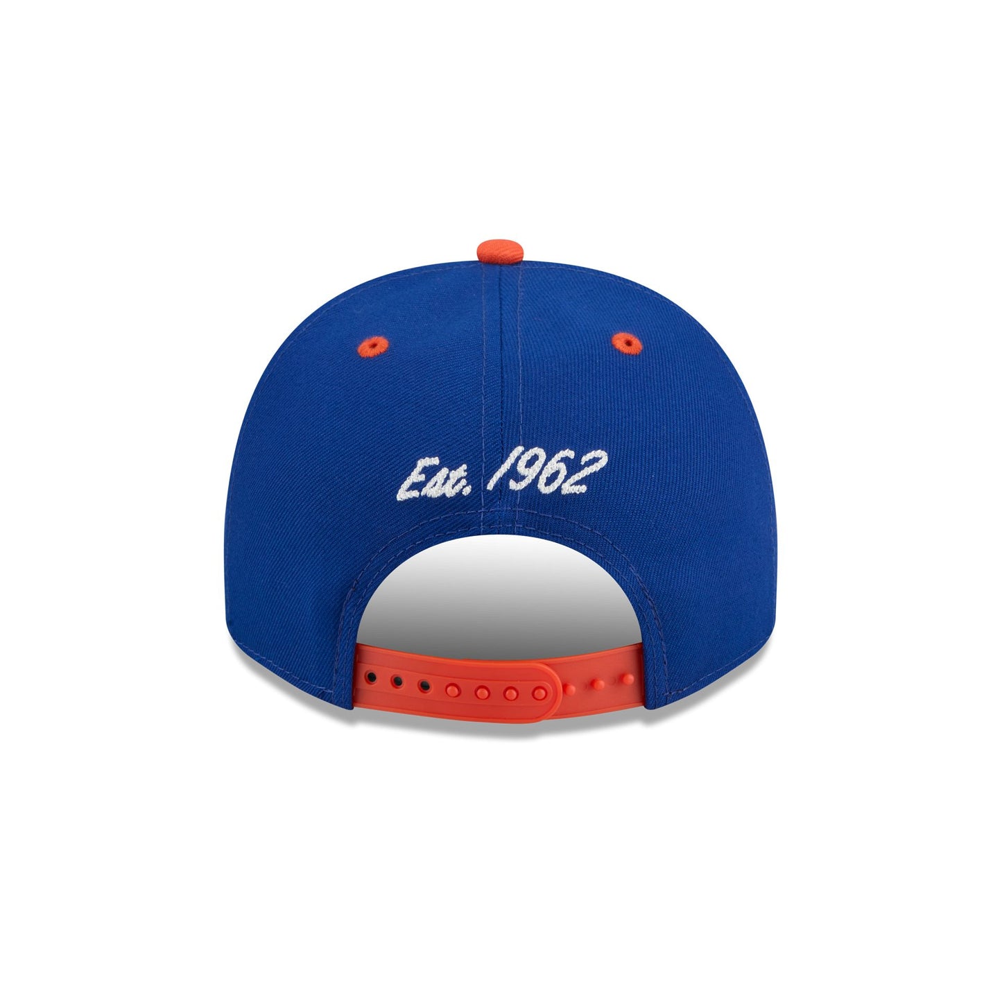 The New York Mets Arched 9FIFTY A-Frame Snapback features an embroidered Mets arched graphic at the front panels with a team graphic at the right-wear side. Additional details include the establishment year above an adjustable snapback closure at the rear and a gray undervisor.