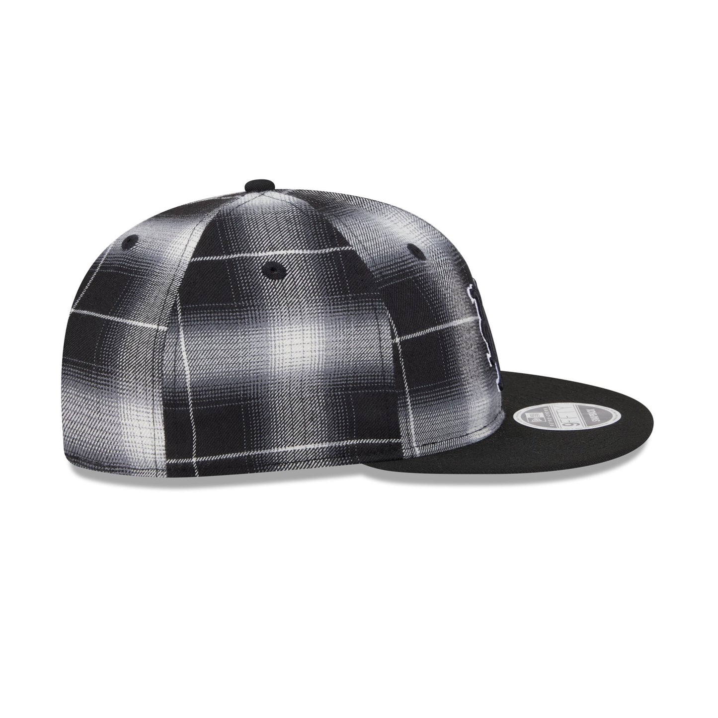 The New York Mets Black and White Plaid Retro Crown 9FIFTY Snapback features an embroidered Mets logo at the front panels with a black visor, a gray undervisor, and a snapback closure at the rear.