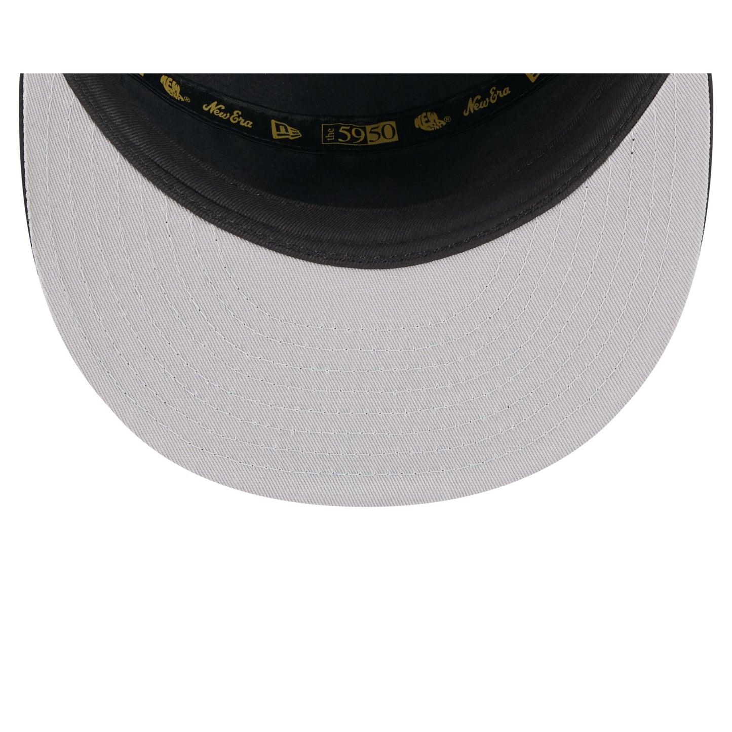 The New York Mets Black Poly Rope 59FIFTY Split Panel Fitted Cap features a woven Mets logo at the front panels with a matching MLB Batterman embroidered at the rear. Additional details include a rope at the visor and a gray undervisor.