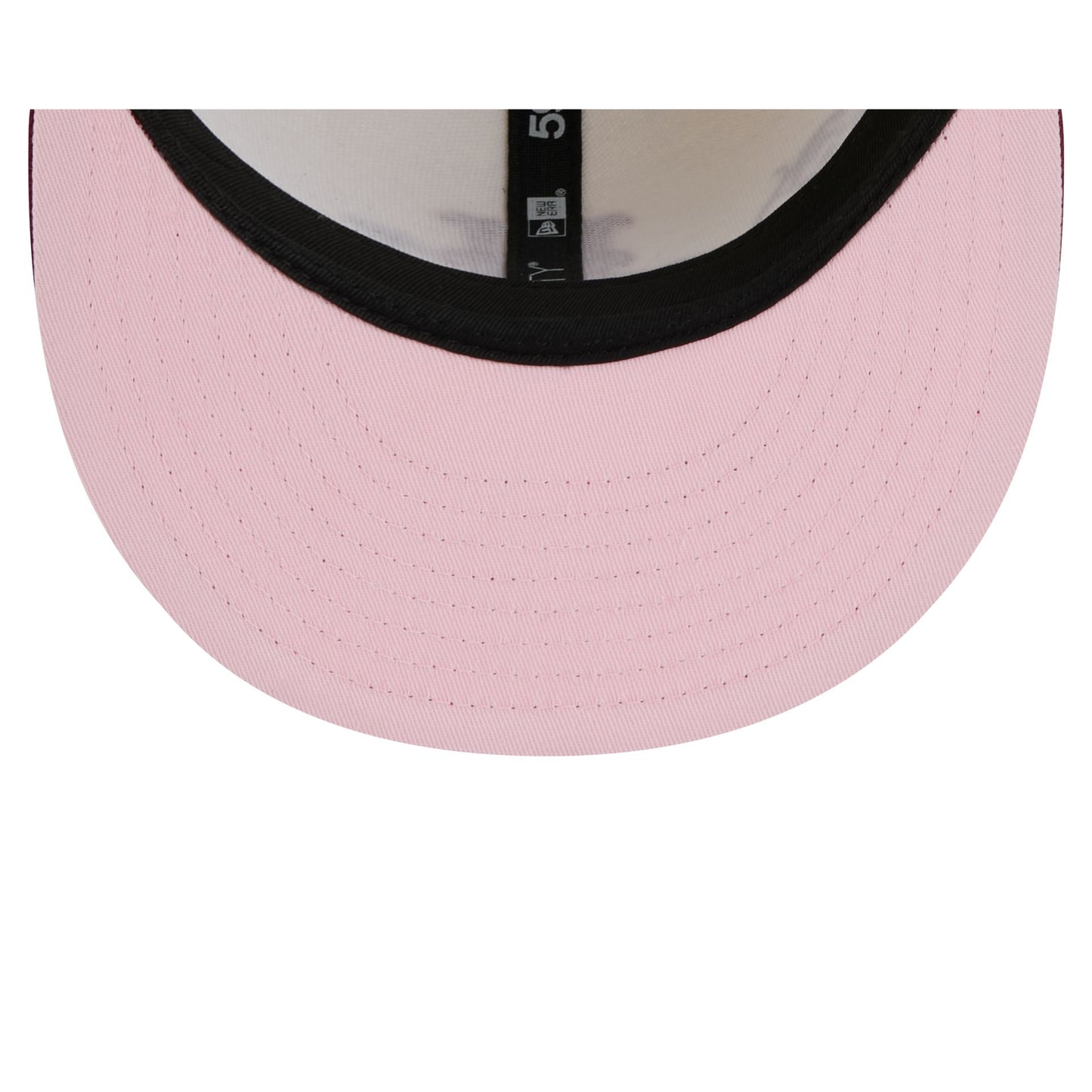 The New York Mets Cherub 59FIFTY Fitted Cap features an embroidered Mets logo and cherub angel at the front panels with a matching MLB Batterman logo at the rear and a pink undervisor.