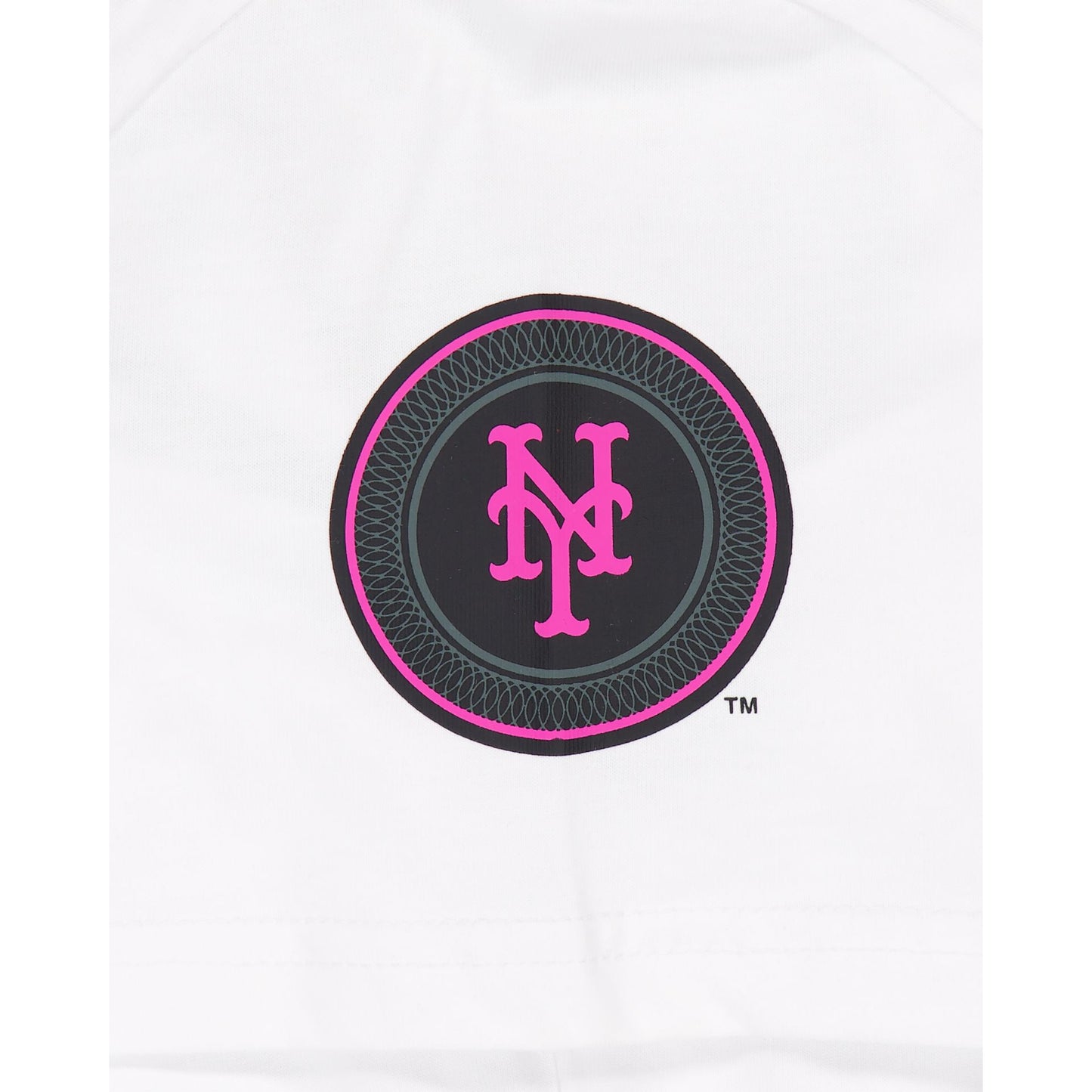 The New York Mets City Connect Women's T-Shirt features a screen-printed Mets wordmark above a team logo at the front with a matching logo at the left sleeve.