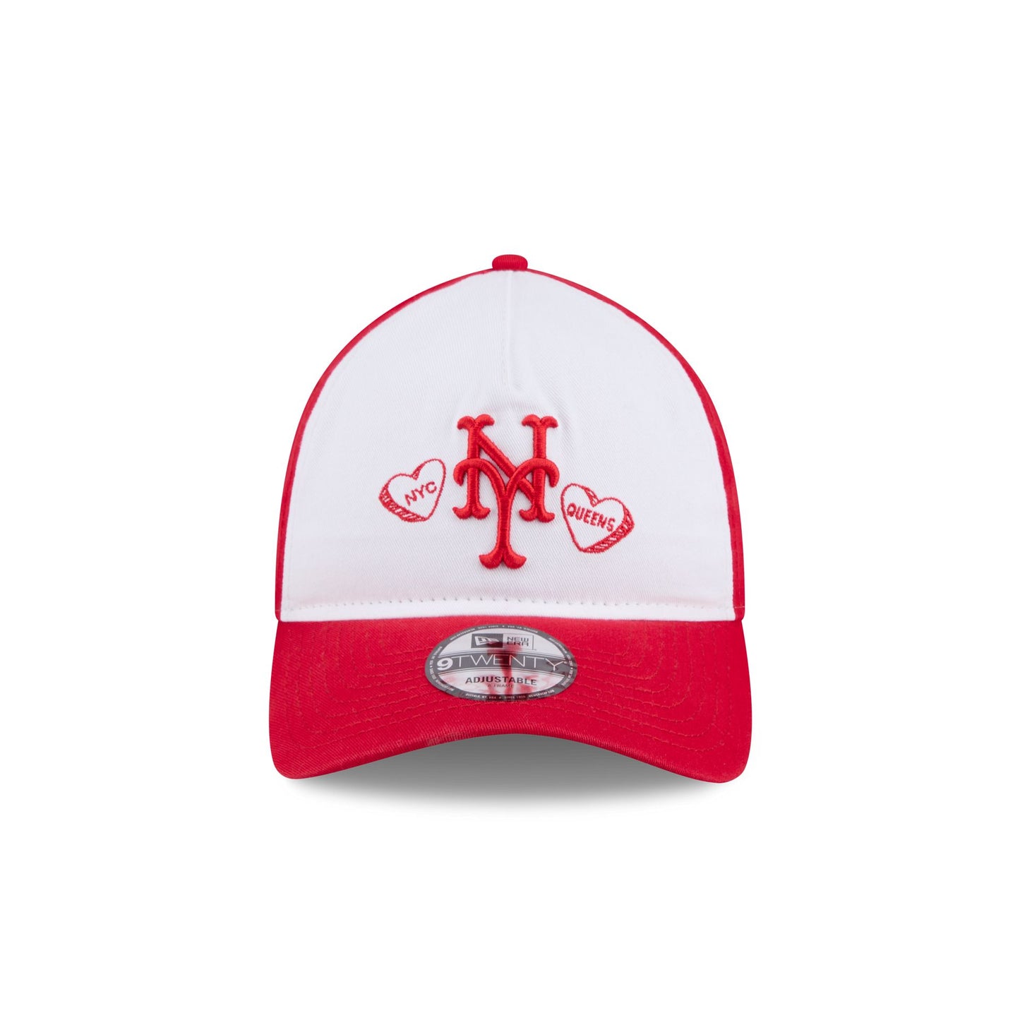 The New York Mets Conversation Hearts 9TWENTY A-Frame Adjustable Cap features an embroidered Mets logo with conversation hearts at the front panels. Additional details include an adjustable D-Ring closure at the rear and a pink undervisor.