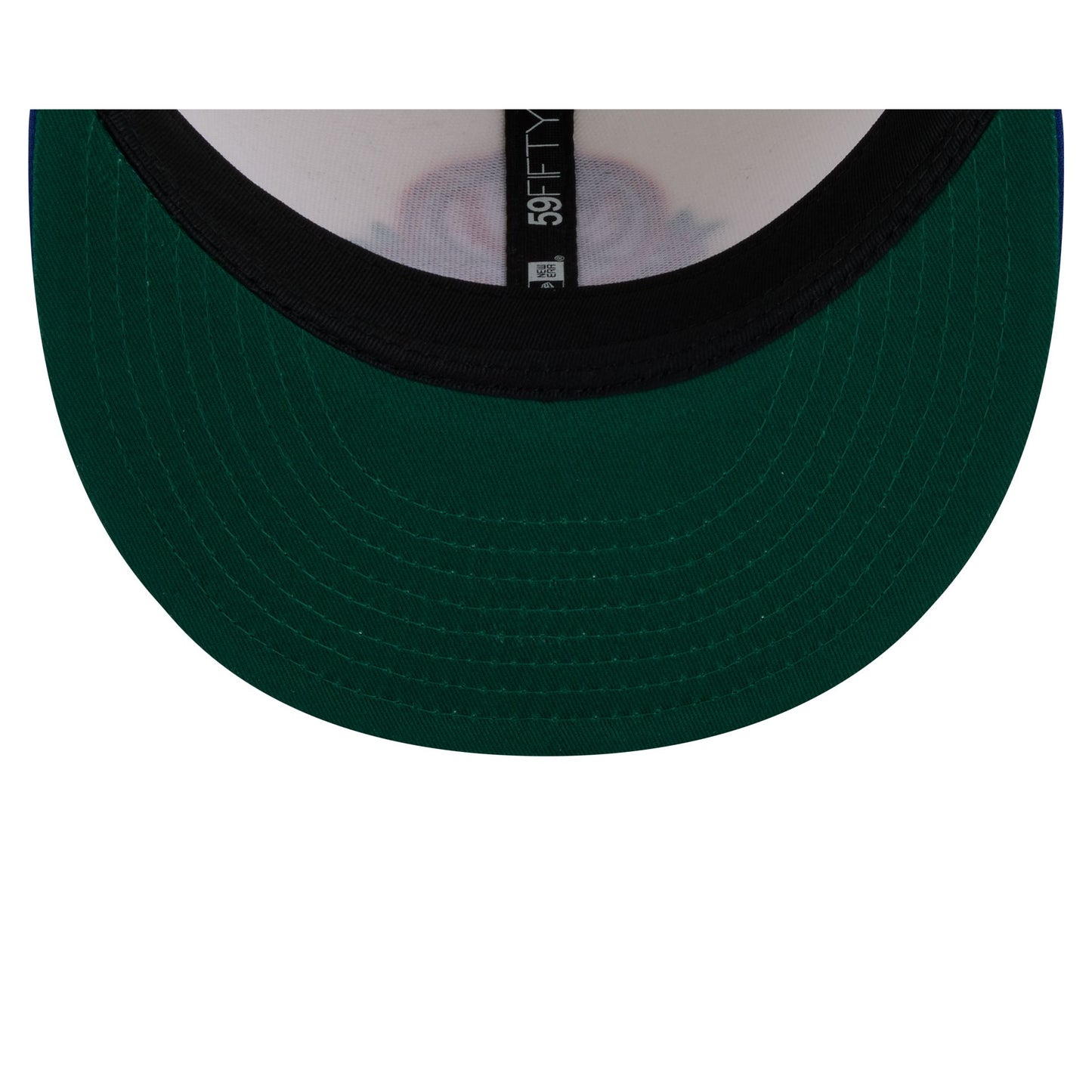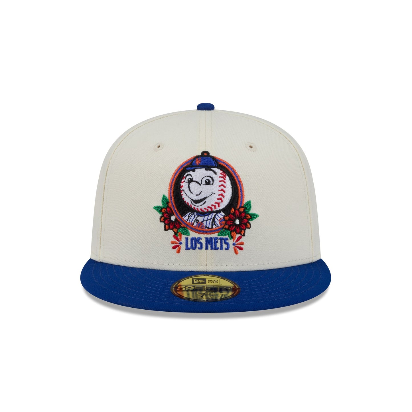 The New York Mets Day of the Dead Sugar Skull Mascot 59FIFTY Fitted Cap features an embroidered Mets Mascot with flowers at the front panels with a skeletal mascot at the right-wear side. Additional details include the MLB Batterman logo at the rear and a green undervisor.