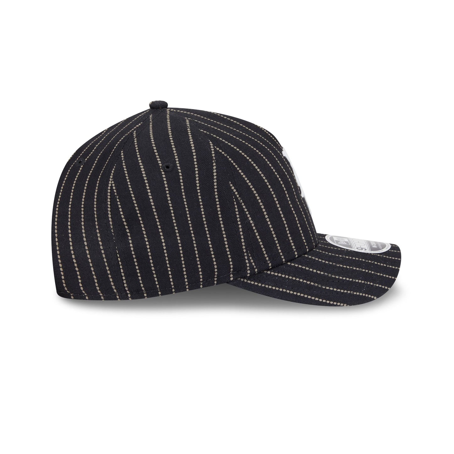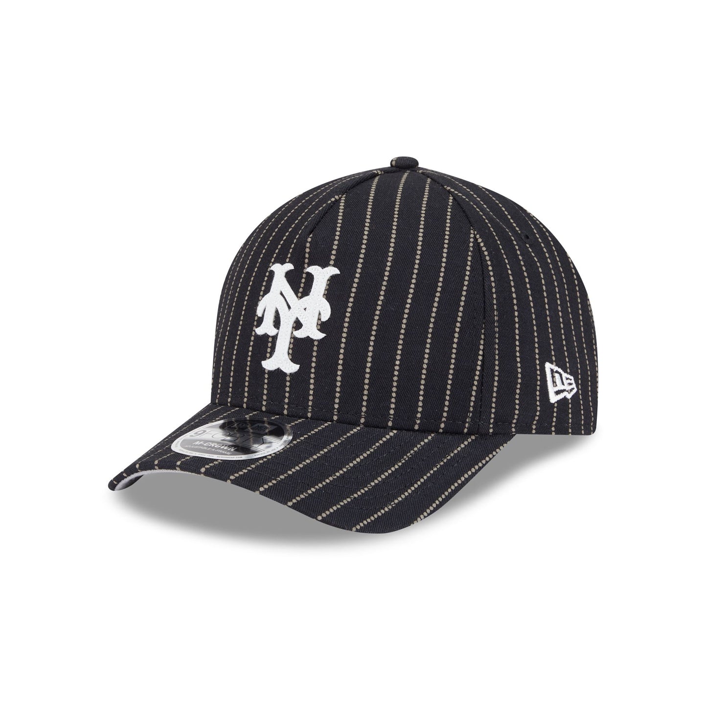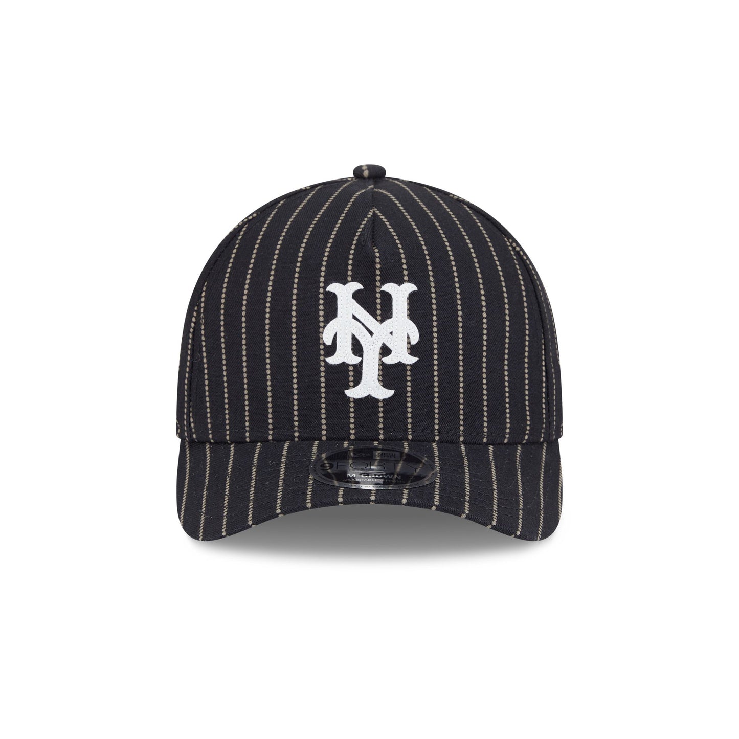 The New York Mets Dotted Pinstripe 9FORTY M-Crown A-Frame Adjustable Cap features an embroidered Mets Cooperstown logo at the front panels against a specialty Japanese milled selvedge denim from Three Looms Japan Fabrics throughout the cap. Additional details include a team wordmark above an adjustable belt closure at the rear and a gray undervisor.