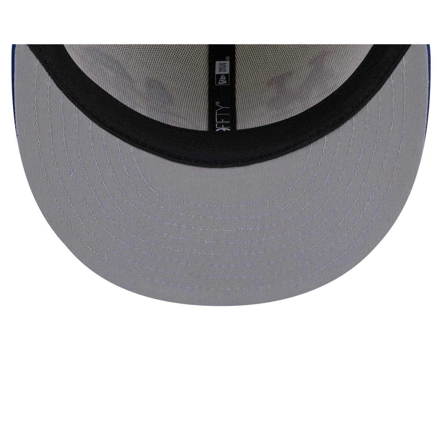The New York Mets Francisco Lindor Chrome White 59FIFTY Fitted Cap features an embroidered Mets logo at the right panel and the player's signature and number at the right. Additional details include an MLB Batterman logo at the rear and a gray undervisor.