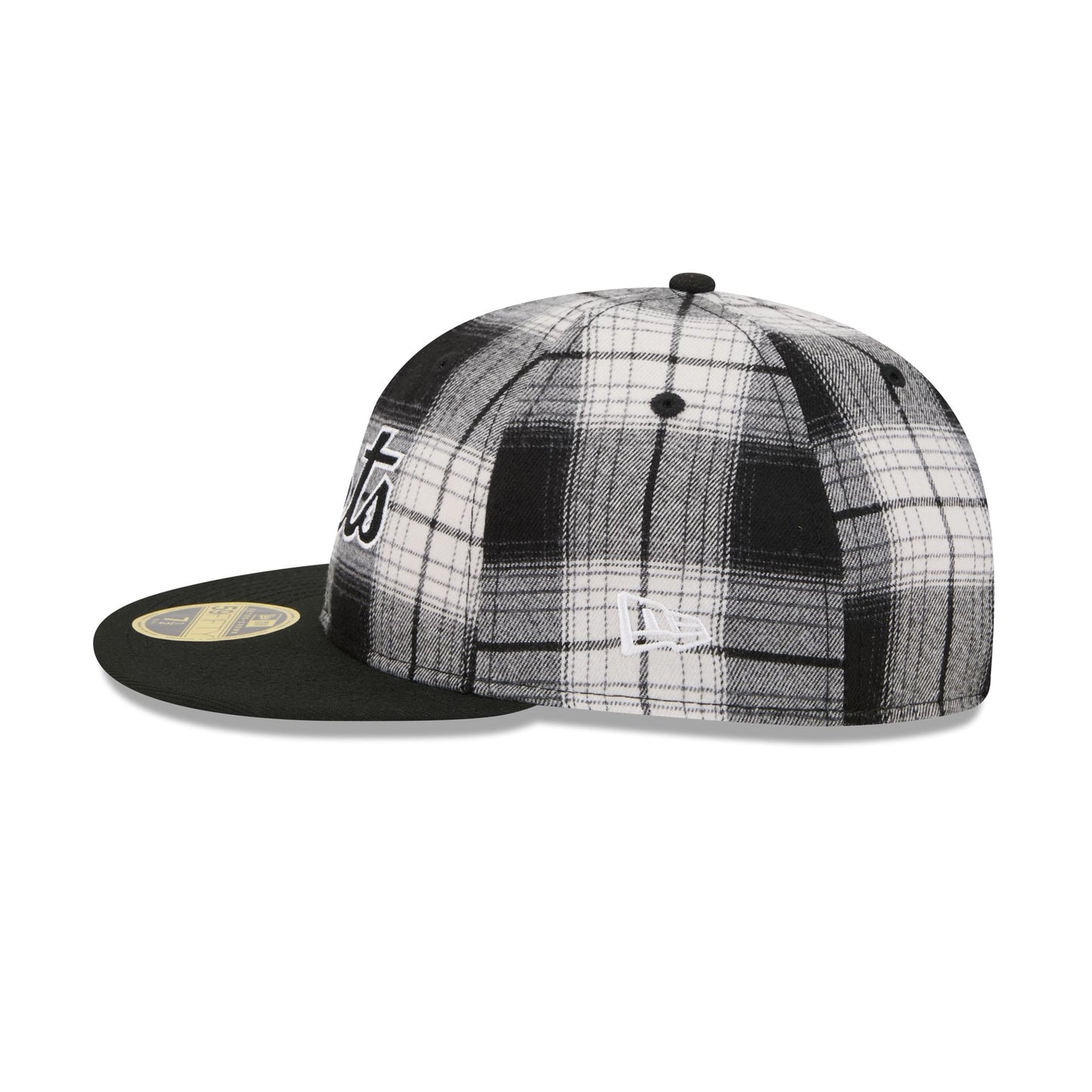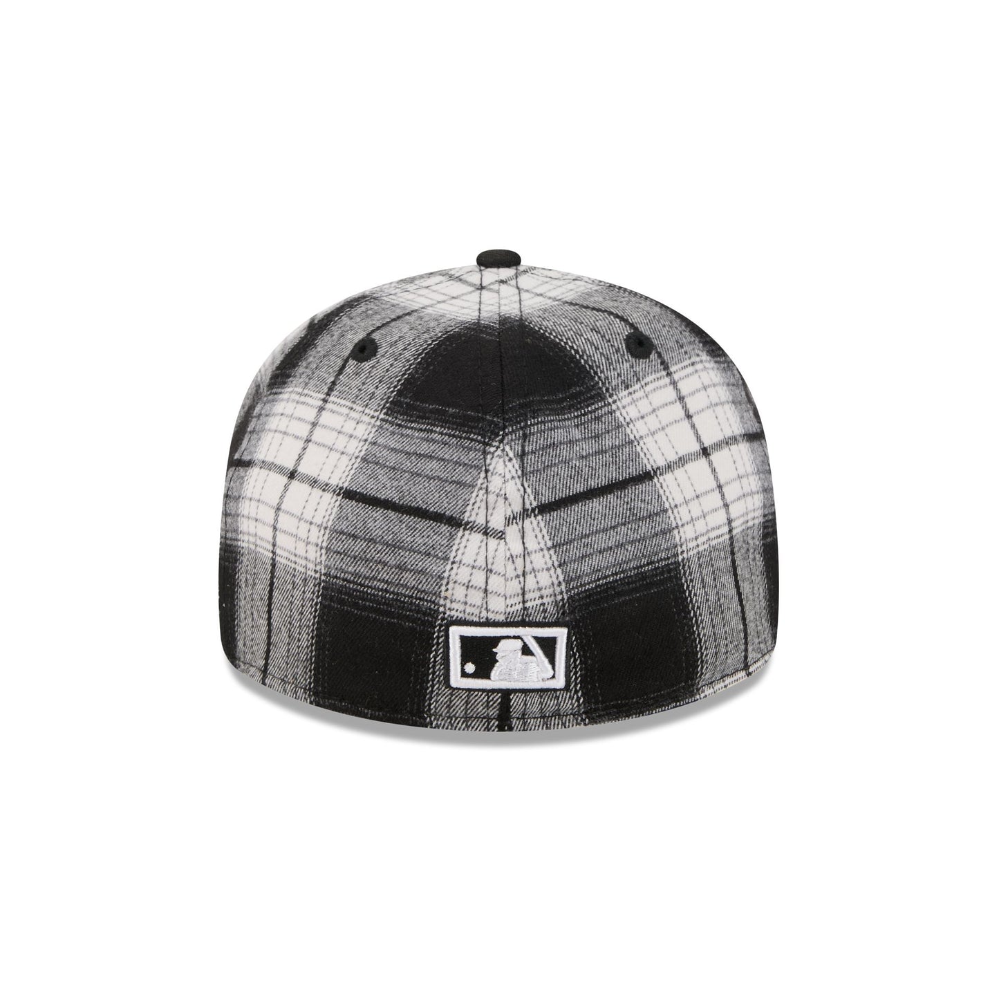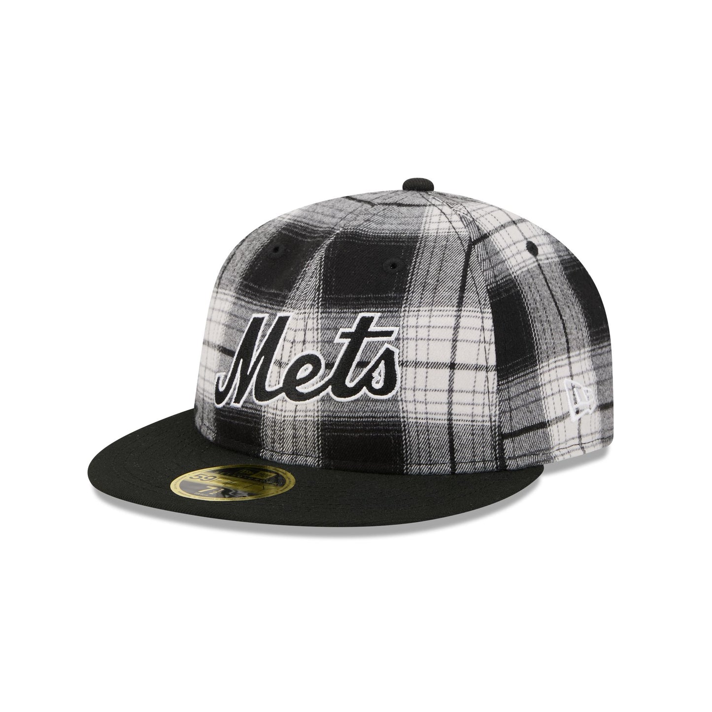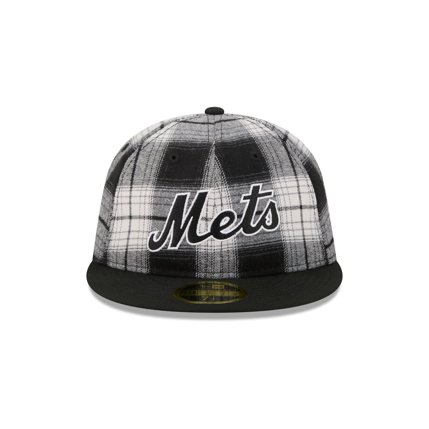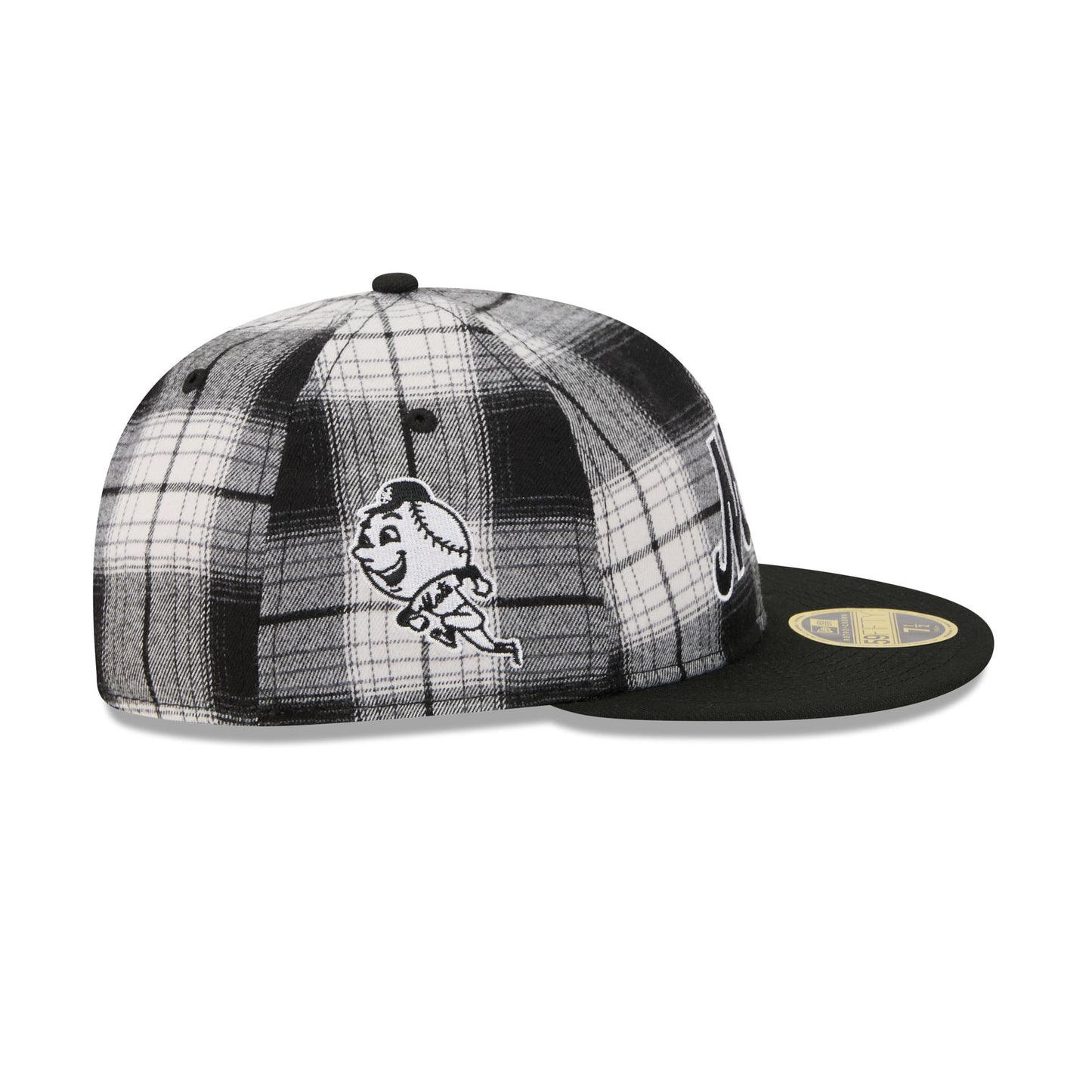 The New York Mets Grunge Plaid Retro Crown 59FIFTY Fitted Cap features an embroidered Mets Cooperstown wordmark at the front panels with a matching MLB Batterman logo at the rear, a team logo at the right-wear side, and a black undervisor.
