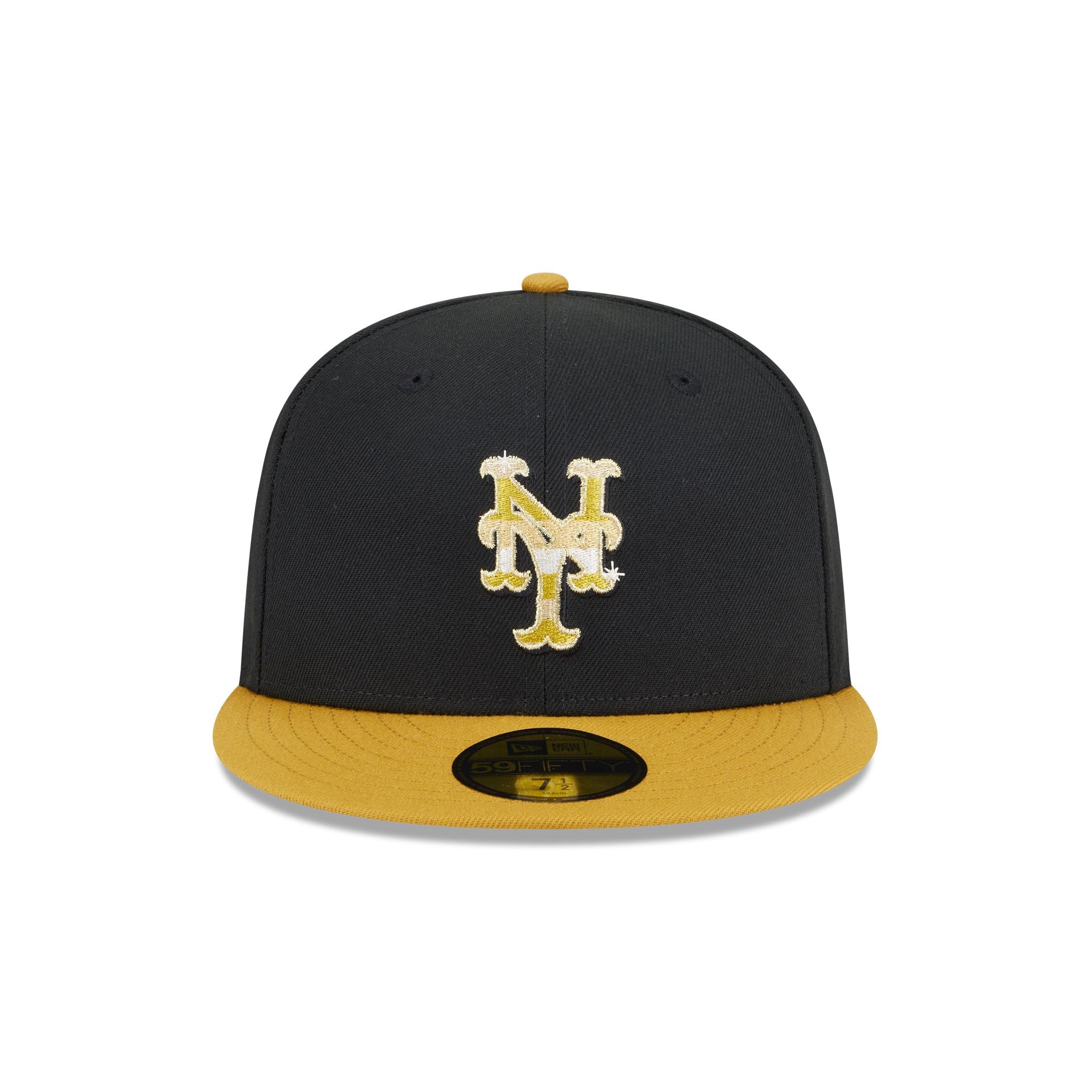 The New York Mets Metallic Gold Logo 59FIFTY Fitted Cap features an embroidered gold Mets logo at the front panels with a matching MLB Batterman logo at the rear. Additional details include a gold visor and a gray undervisor.