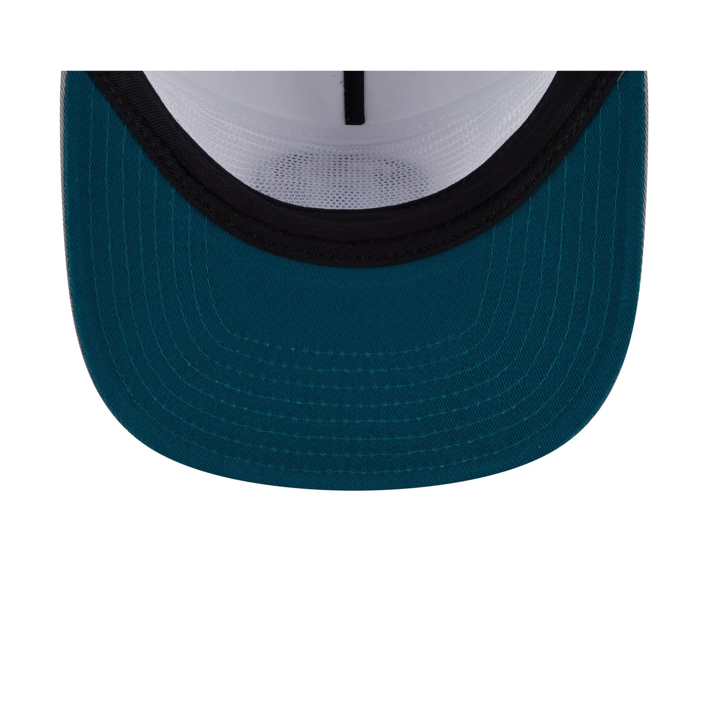The New York Mets Optic White Golfer features an embroidered Mets logo at the front panels with a matching team wordmark at the right-wear side. Additional details include a snapback closure at the rear and a teal undervisor.
