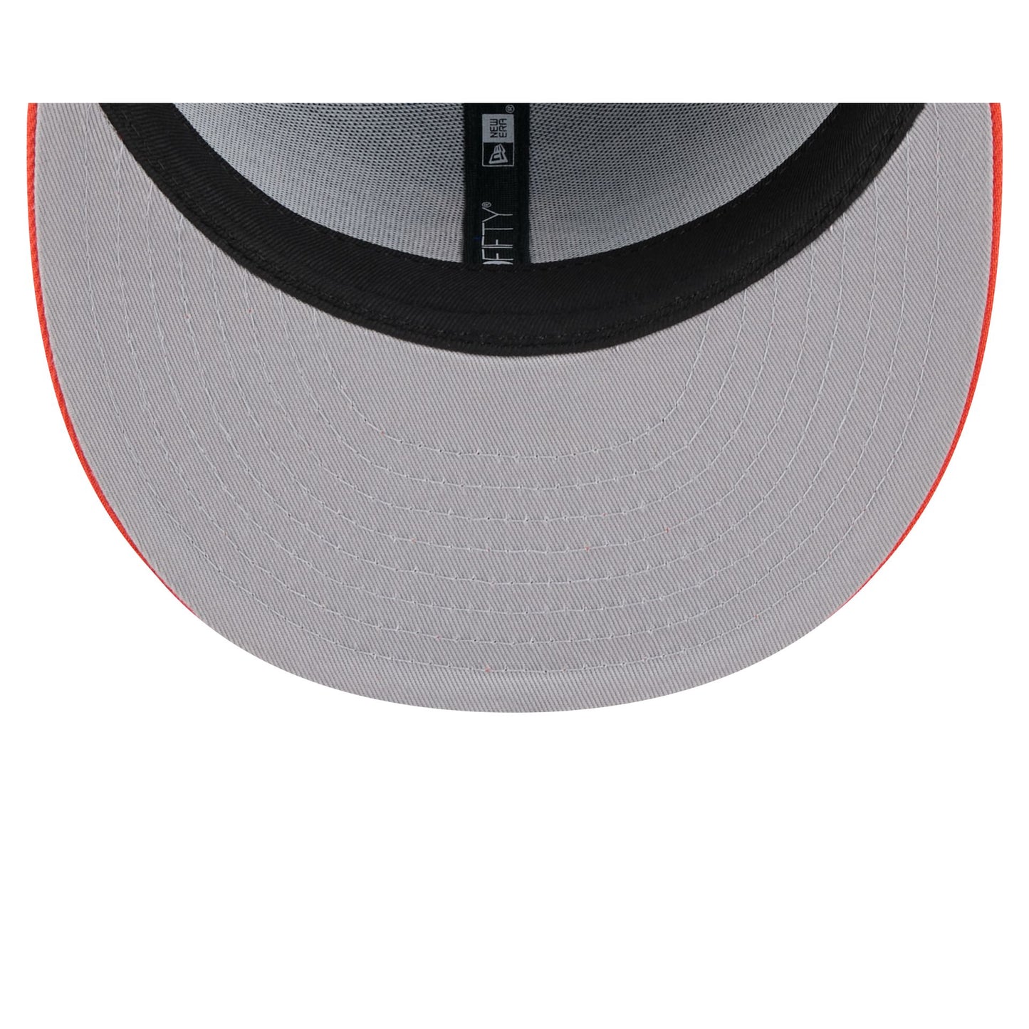 The New York Mets Pinstripe League Pin 59FIFTY Fitted Cap features an embroidered Mets logo at the front panels with a League pin at the front right panel. Additional details include pinstripes, a matching MLB Batterman logo at the rear, and a gray undervisor.