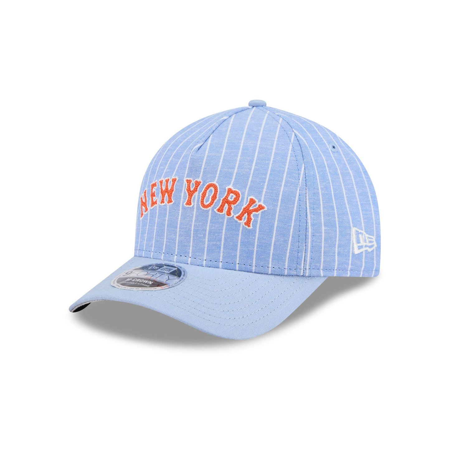 The New York Mets Pinstripe Linen 9FORTY M-Crown A-Frame Snapback Cap features an embroidered Mets wordmark at the front panels with a snapback closure at the rear and a gray undervisor.