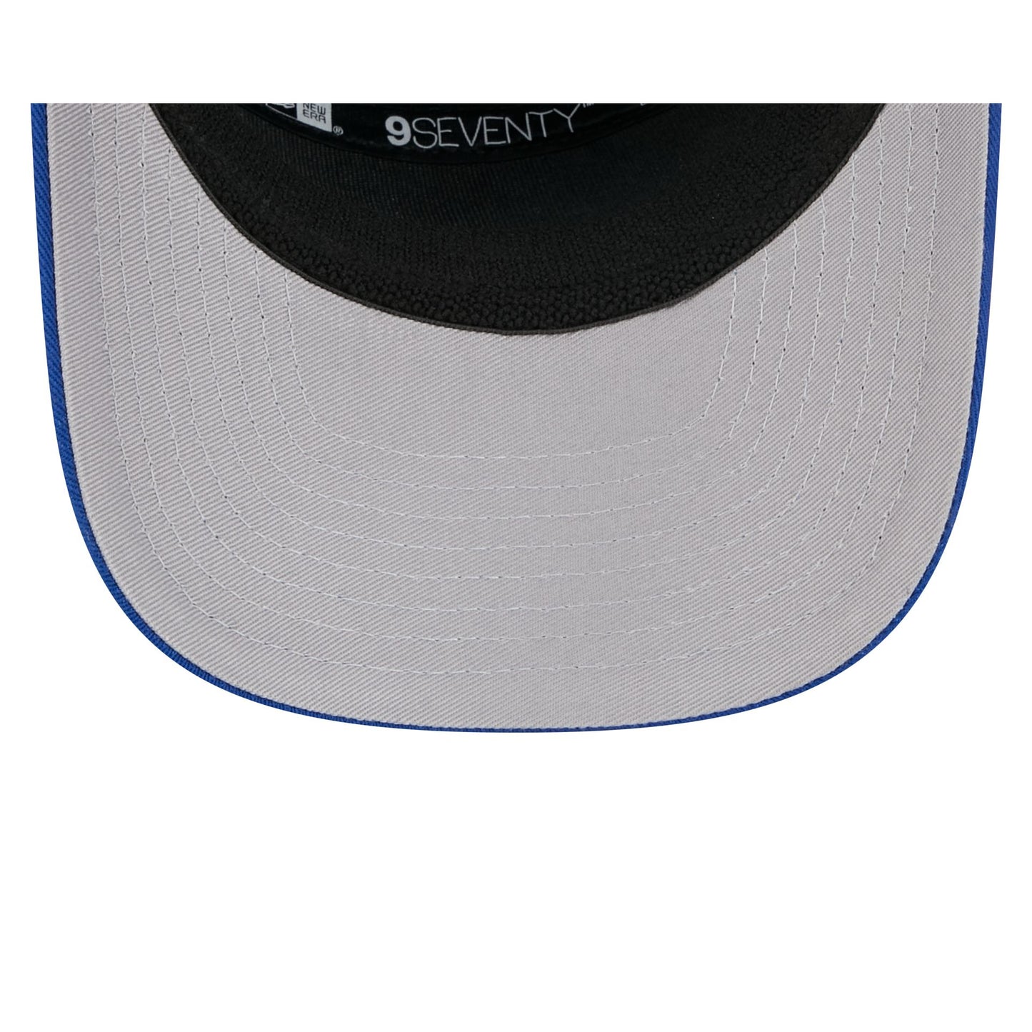 The New York Mets Split Panel 9SEVENTY Stretch-Snap features an embroidered Mets logo at the front panel with a split crown construction and a rope at the visor. Additional details include an adjustable stretch-snap closure at the rear and a gray undervisor.