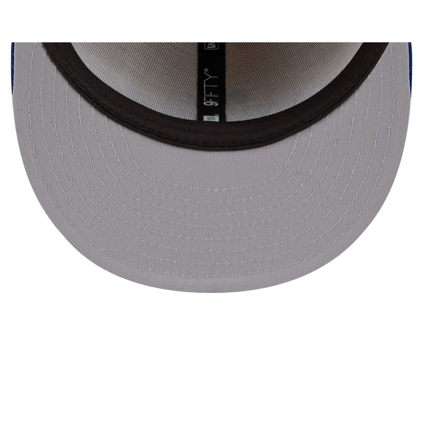 The New York Mets Team Art 9FIFTY Snapback features an embroidered Mets wordmark at the front panels with art. Additional details include a team wordmark above a snapback closure at the rear and a gray undervisor.