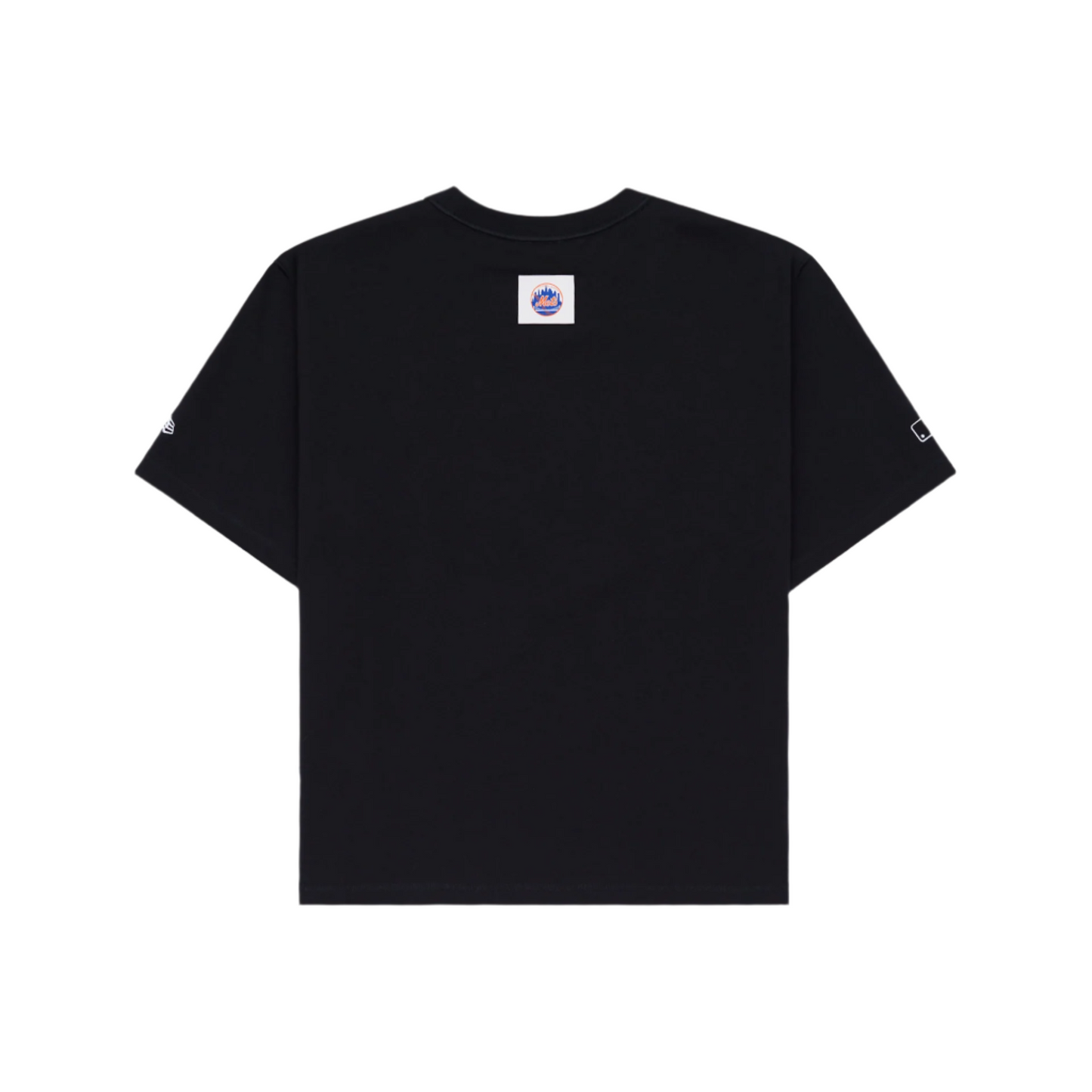 The New York or Nowhere x New York Mets Black Relaxed Logo T-Shirt features a screen-printed Mets logo and a New York or Nowhere wordmark at the front with a woven Mets tag at the rear.