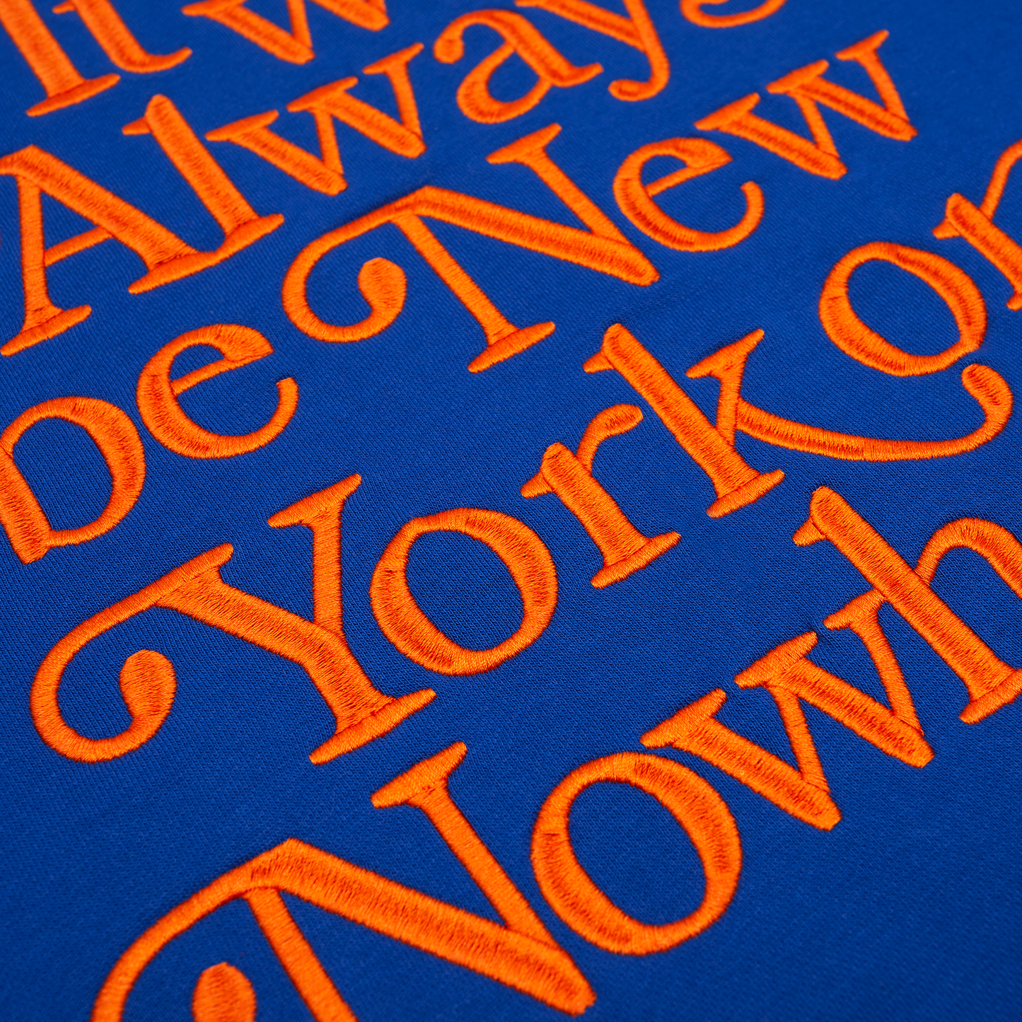The New York or Nowhere x New York Mets Light Royal Motto Hoodie features an embroidered New York or Nowhere wordmark at the front with an It Will Always Be New York Or Nowhere wordmark at the rear. Additional details include a Mets patch and MLB Batterman logo at the right sleeve with a woven Mets x NYON tag at the left wrist.