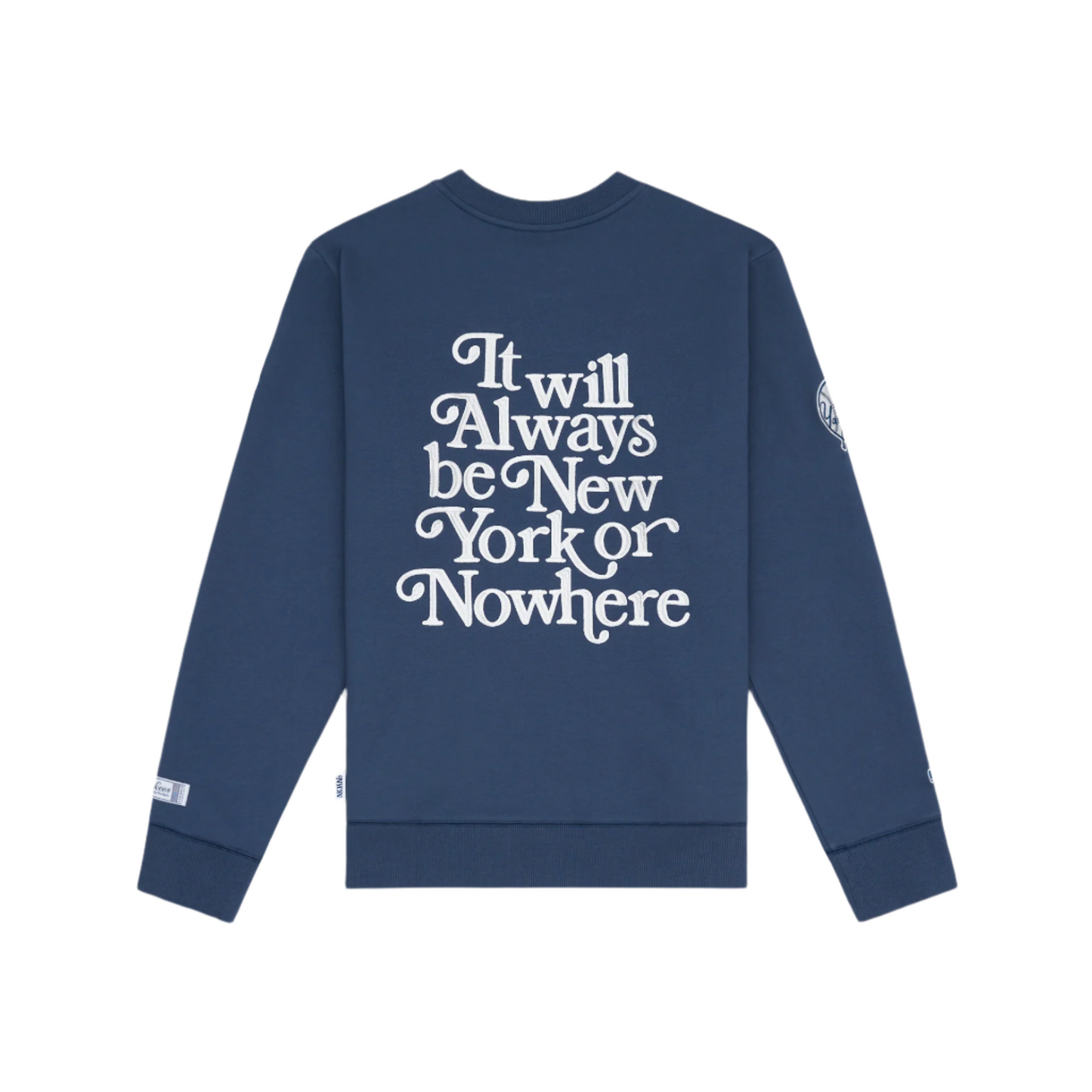 The New York or Nowhere x New York Yankees Navy Motto Crewneck features an embroidered Yankees New York or Nowhere wordmark at the front with an It Will Always Be New York Or Nowhere wordmark at the rear. Additional details include a Yankees patch and MLB Batterman logo at the right sleeve with a woven Mets x NYON tag at the left wrist.