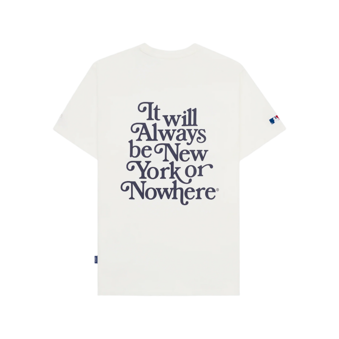 The New York or Nowhere x New York Yankees White Motto Short-Sleeve T-Shirt features a screen-printed Yankees New York or Nowhere wordmark at the front with an It Will Always Be New York Or Nowhere wordmark at the rear. Additional details include a MLB Batterman embroidered at the right arm and tagged at the left hip.