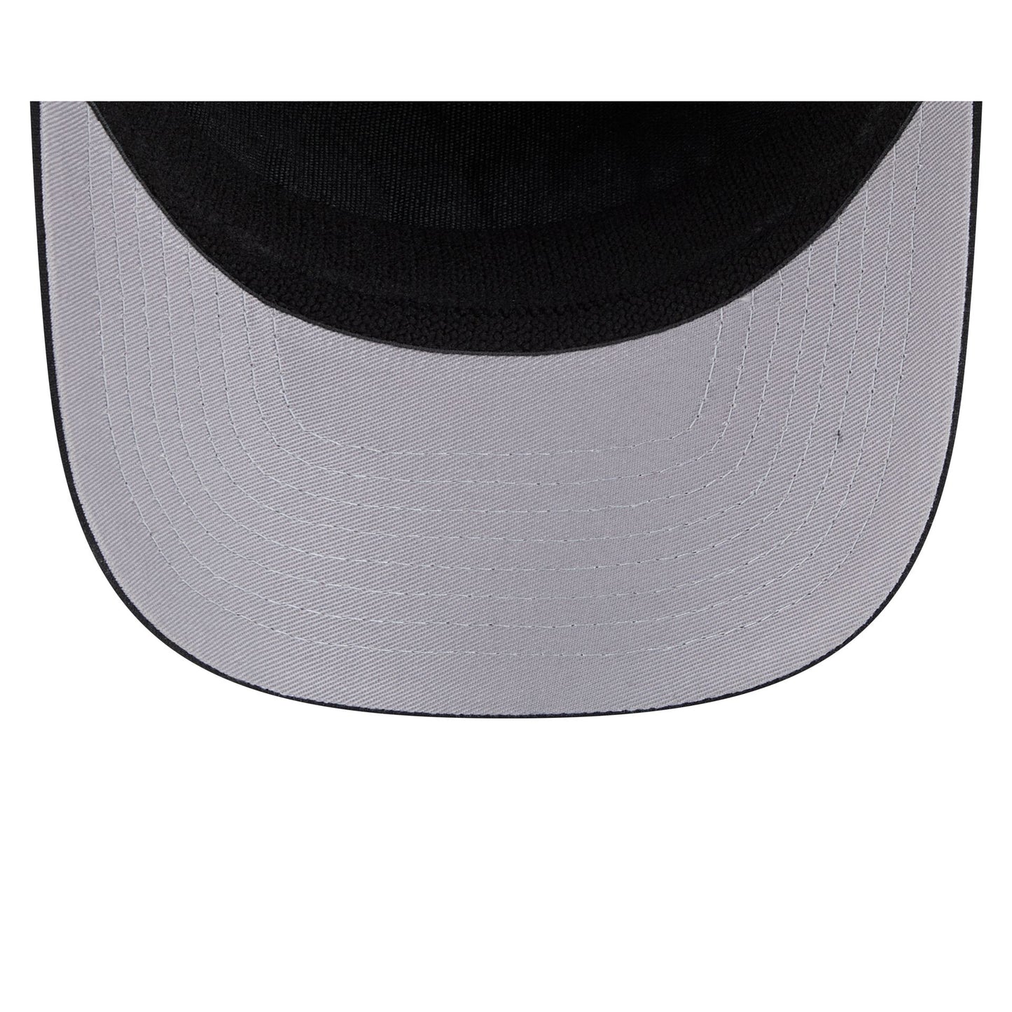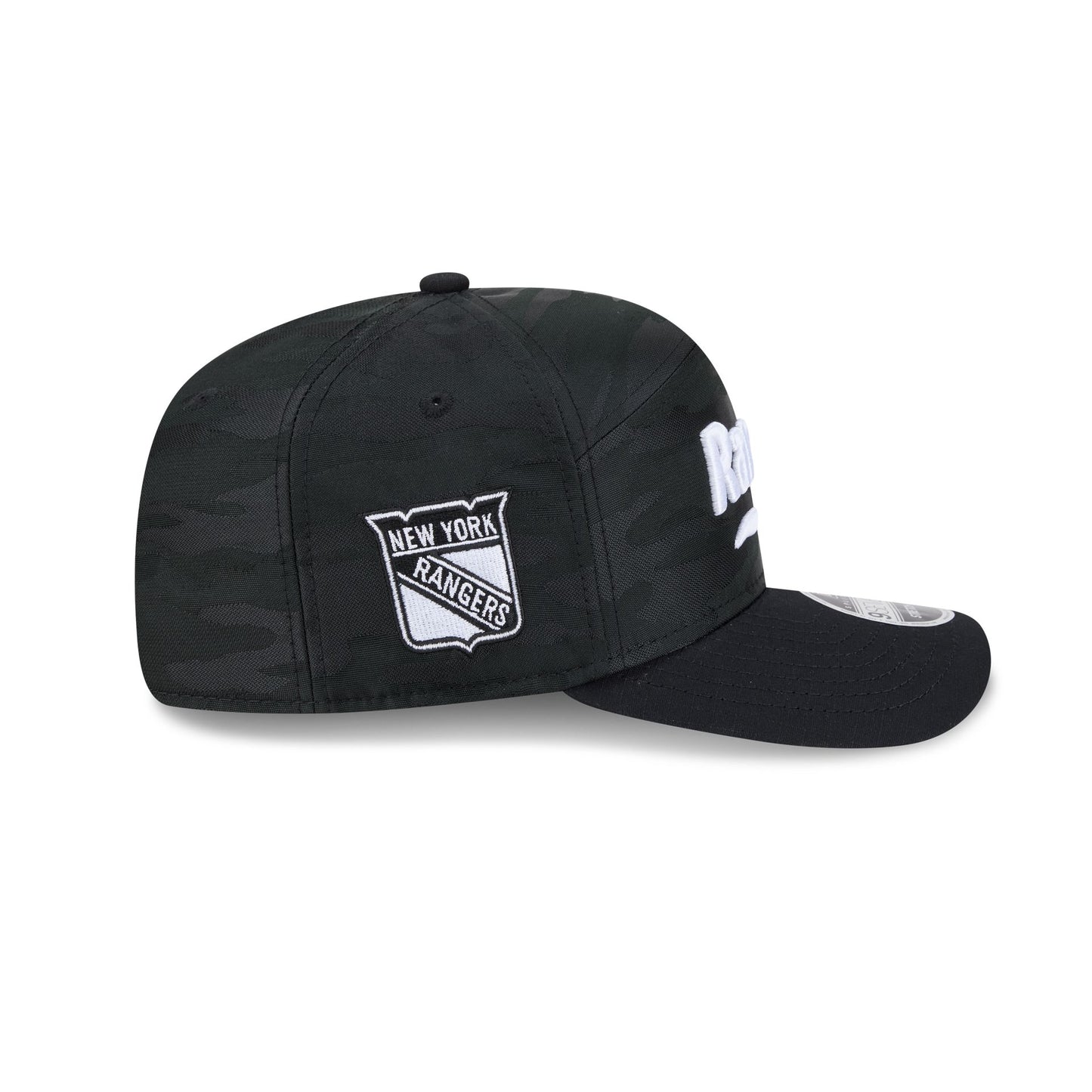 The New York Rangers Black Camo Split Panel 9SEVENTY Stretch-Snap features an embroidered Rangers white wordmark at the front panel with a split crown construction and a team logo at the right-wear side. Additional details include a black camo print throughout, an adjustable stretch-snap closure at the rear, and a gray undervisor.