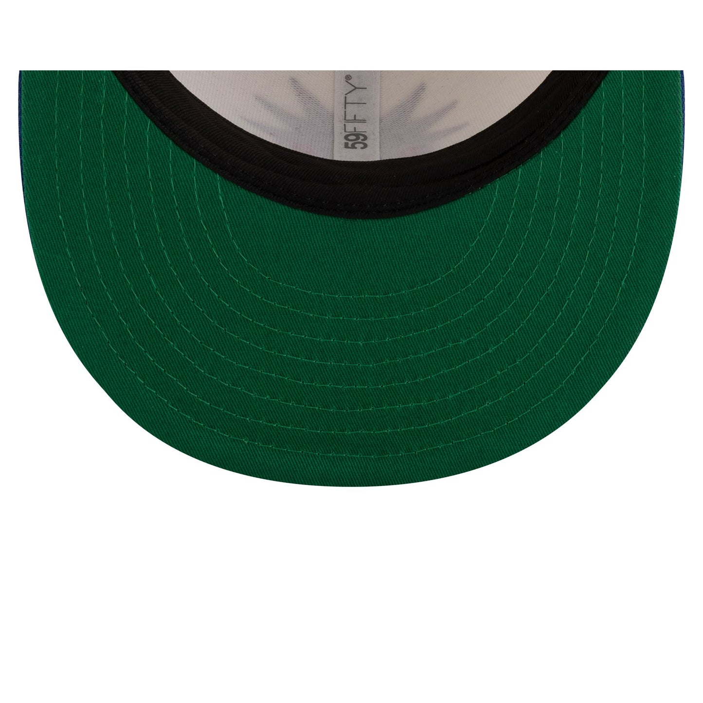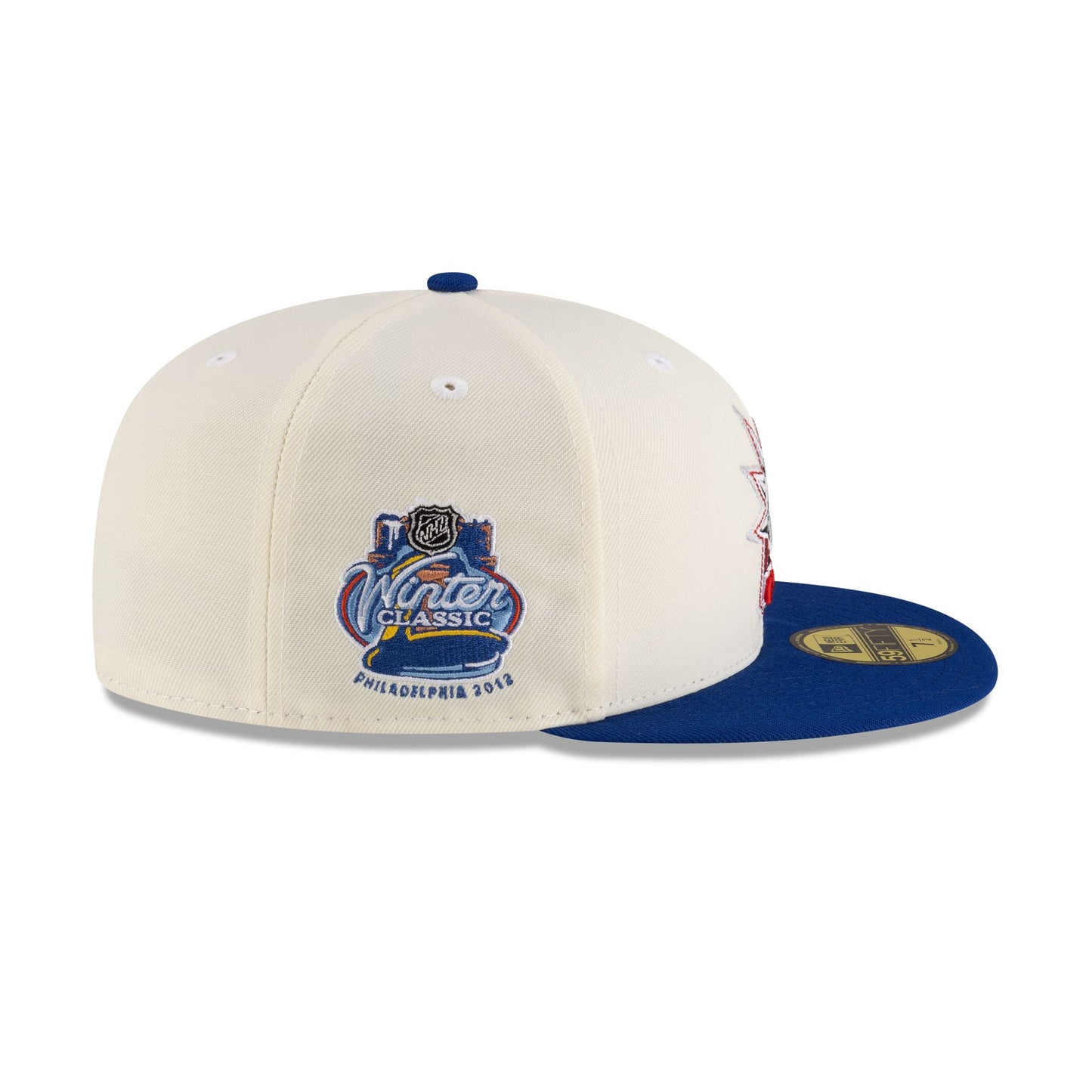 The New York Rangers Chrome Royal 59FIFTY Fitted Cap features an embroidered Rangers logo at the front panels with a matching NHL Shield at the rear. Additional details include a 2012 Winter Classic patch at the right-wear side and a green undervisor.