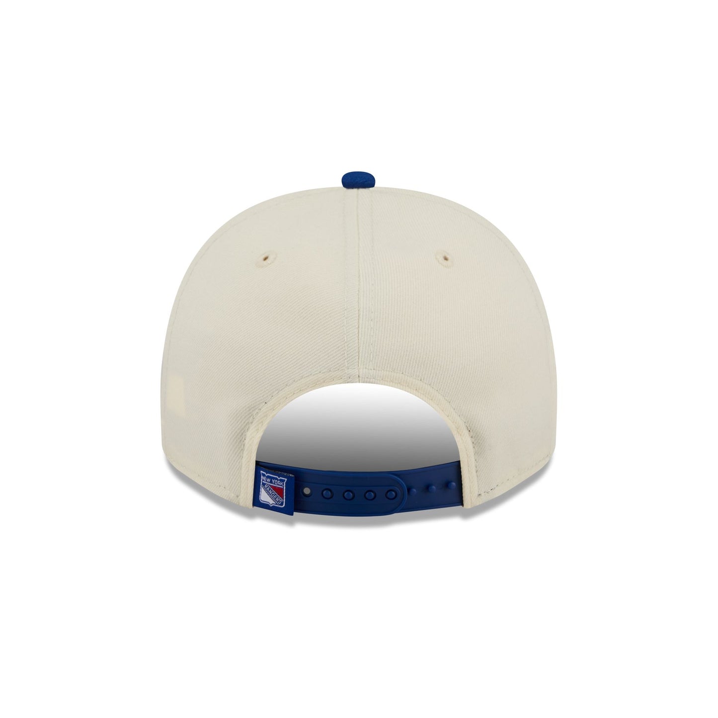 The New York Rangers Chrome White Classic 9FIFTY A-Frame Snapback features an embroidered Rangers graphic at the front panels with an adjustable snapback closure at the rear and a green undervisor.