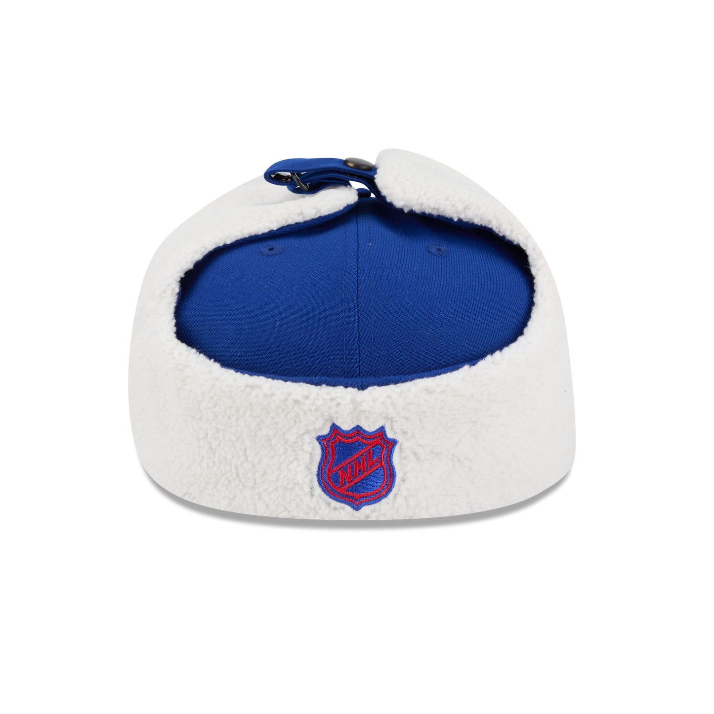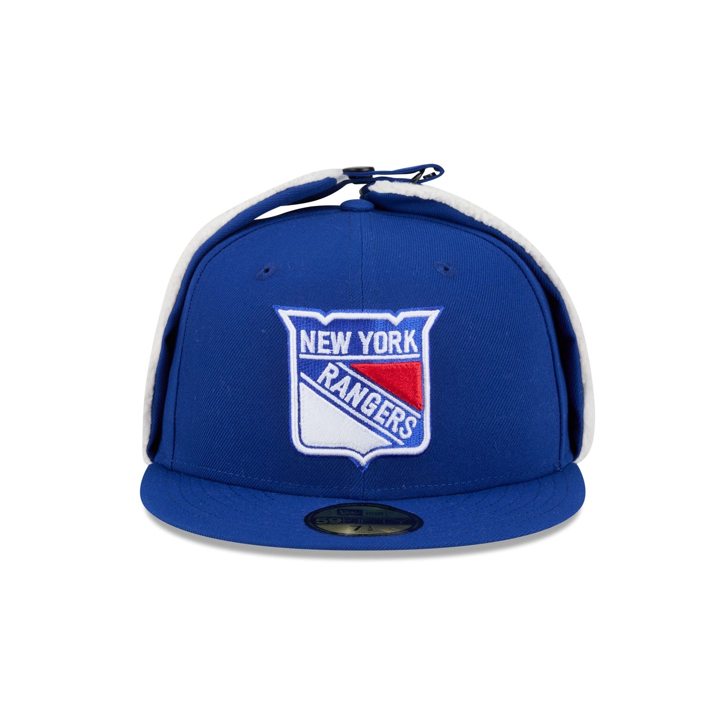 The New York Rangers Classic Dog Ear 59FIFTY Fitted Cap features an embroidered Rangers logo at the front panels with sherpa ear covers with a snap button closure. Additional details include the NHL Shield logo at the rear and a gray undervisor.