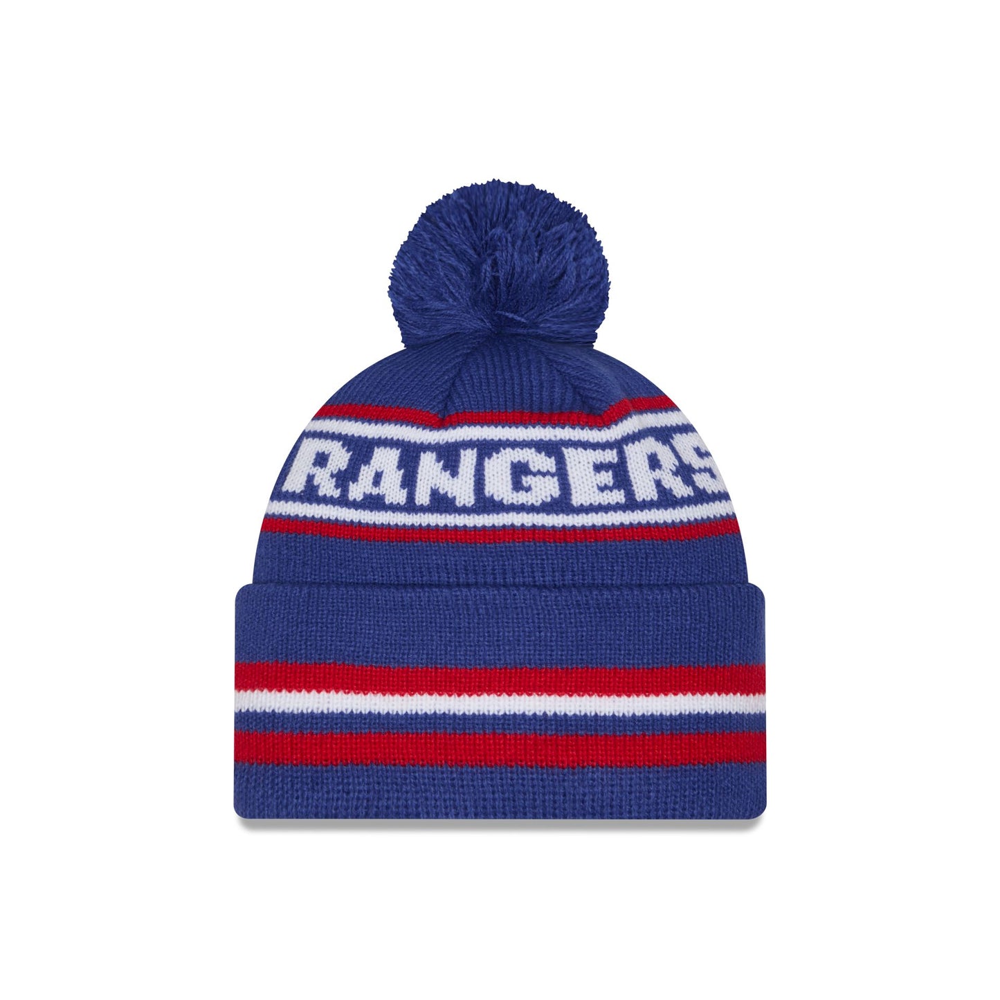 The New York Rangers Classic Pom Knit Hat features an embroidered Rangers logo at the front cuff with a wordmark at the crown and a one-time removable pom.