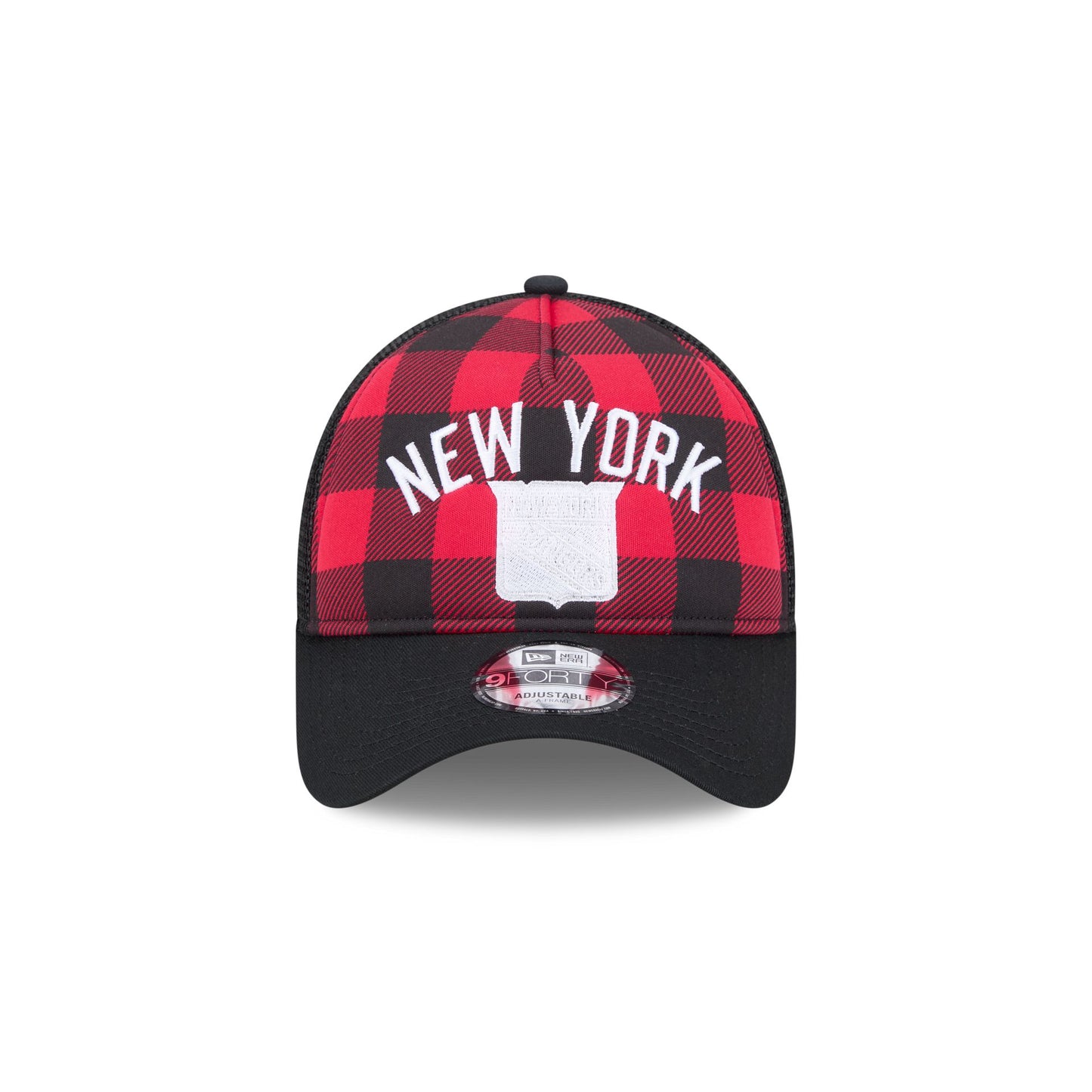 The New York Rangers Evergreen Check 9FORTY A-Frame Trucker features an embroidered Rangers white wordmark and logo at a checkered plaid front panel. Additional details include an adjustable snapback closure at a mesh rear.