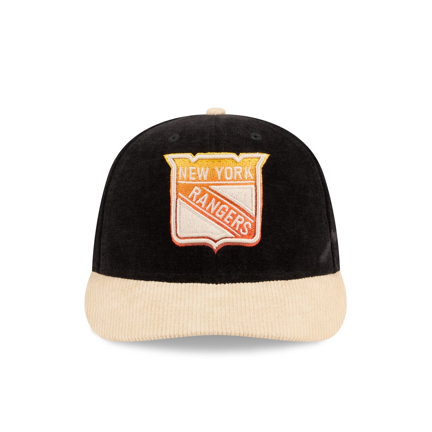 The New York Rangers Fall Velvet Low Profile 59FIFTY Fitted Cap features an embroidered Rangers fall gradient logo at the front panels against a velvet fabrication throughout. Additional details include an antique brass leather stitch down city plate at the right-wear side, a matching NHL Shield logo at the rear, and a green undervisor.