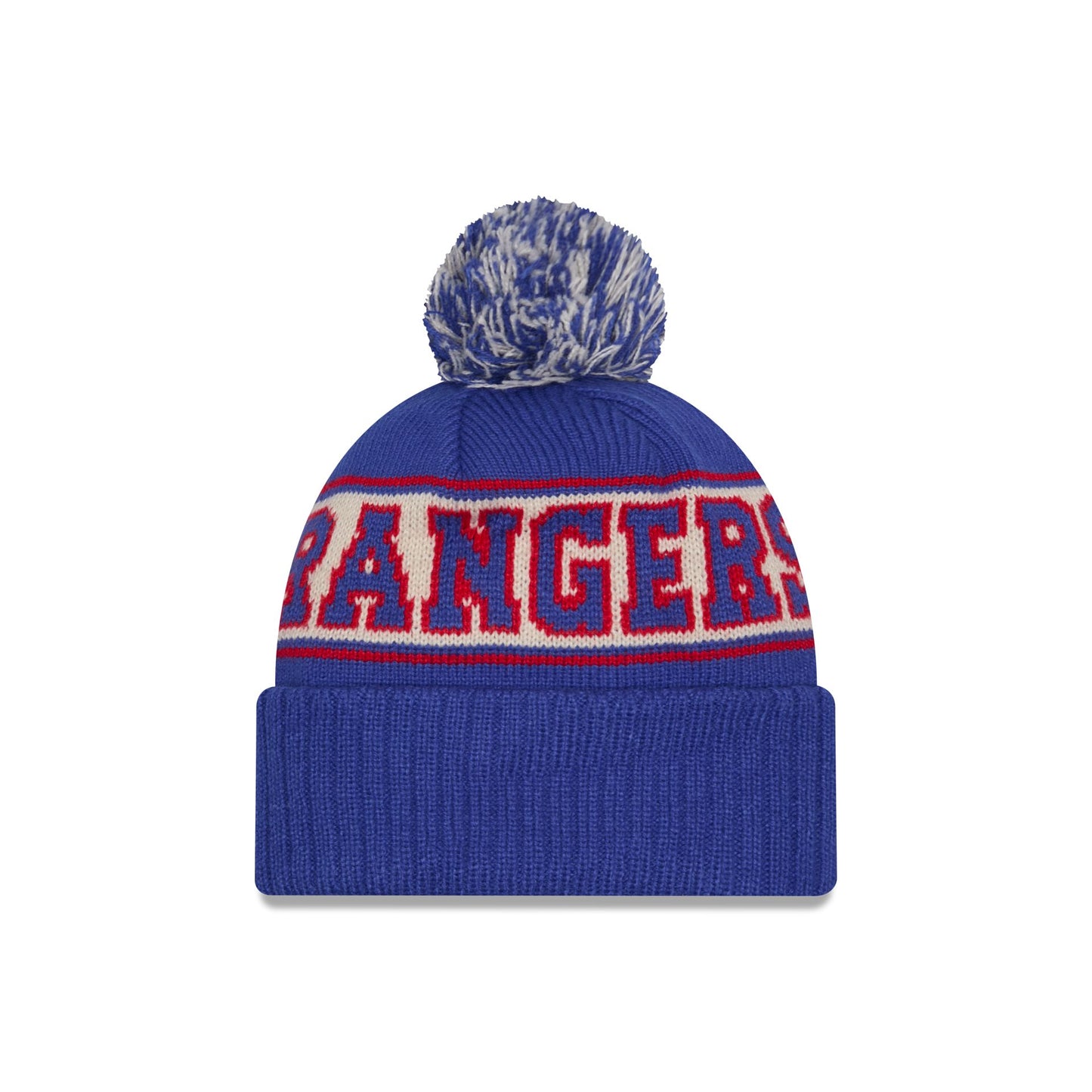 The New York Rangers Retro Pom Knit Hat features an embroidered Rangers logo at the front cuff with a team wordmark at the crown and a one-time removable pom.