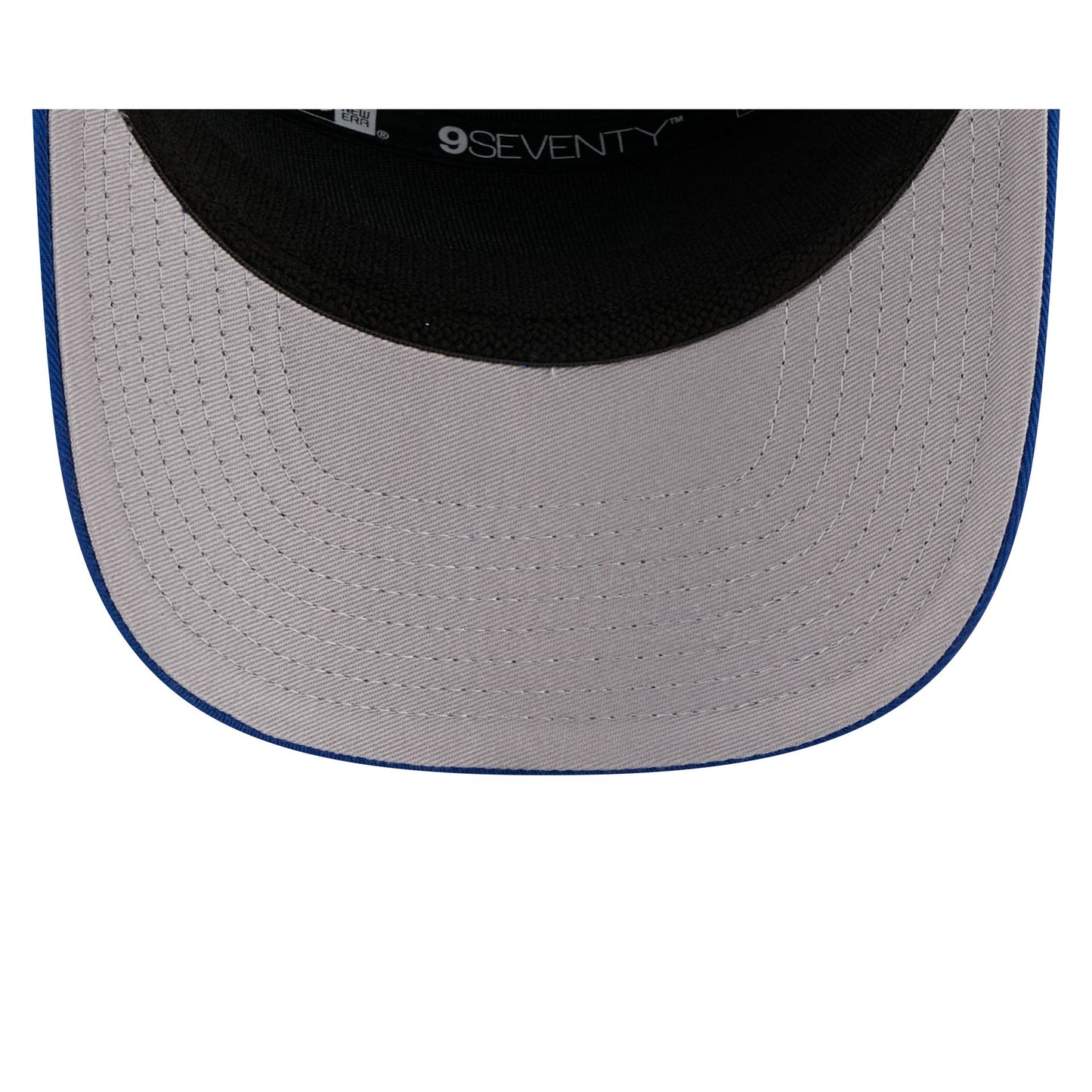 The New York Rangers Split Panel 9SEVENTY Stretch-Snap features an embroidered Rangers logo at the front panel with a split crown construction and a rope at the visor. Additional details include an adjustable stretch-snap closure at the rear and a gray undervisor.