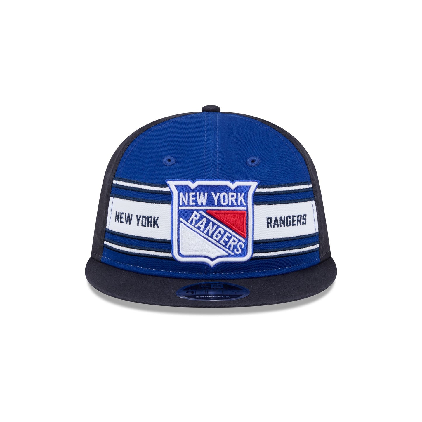 The New York Rangers Team Stripes Retro Crown 9FIFTY Snapback features an embroidered Rangers team stripe logo and wordmark at the front panels with an adjustable snapback closure at the rear.