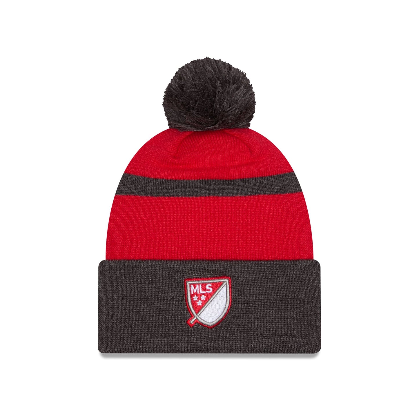 The New York Red Bulls 2025 MLS Kickoff Pom Knit features an embroidered Red Bulls logo at the front cuff with a matching MLS Shield at the rear and a one-time removable pom.