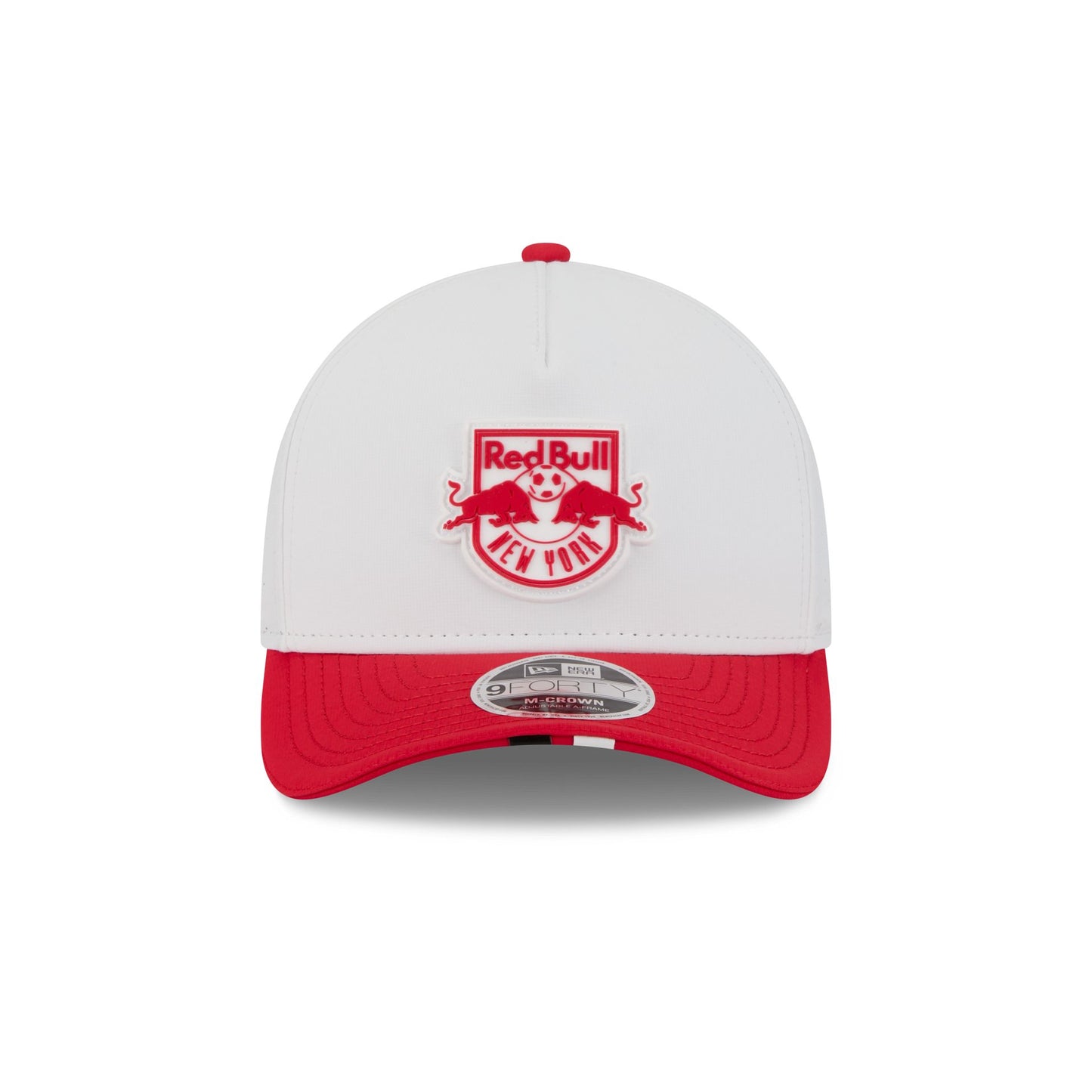 The New York Red Bulls 2026 MLS Kickoff 9FORTY M-Crown A-Frame Snapback features a stitch-down silicone Red Bulls logo patch at the front panel with a matching woven MLS Shield tag above a snapback closure at the rear. Additional details include a quill tech performance fabrication with a red visor accented with team color stripes at the front.