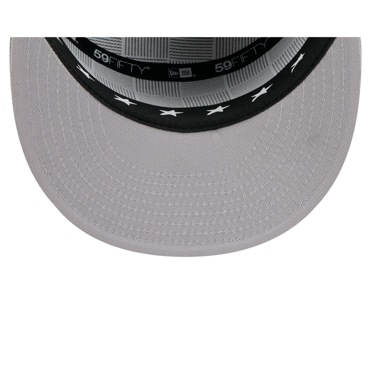 The New York Yankees 2025 All-Star Game Split Panel 59FIFTY Fitted Cap features an embroidered Yankees logo at the front panels against a split-crown construction with breathable mesh fabric at the side and rear panels. Additional details include stars at the top panel, a 2025 All-Star Game patch at the right-wear side, the MLB Batterman logo at the rear, and a gray undervisor. The cap also features screen-printed stars on the sweatband.