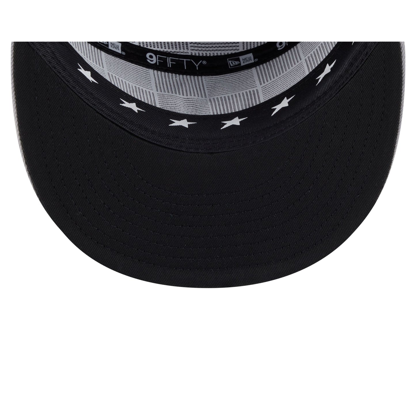 The New York Yankees 2025 All-Star Game Split Panel 9FIFTY Snapback features an embroidered Yankees logo at the front panels against a split-crown construction with breathable mesh fabric at the side and rear panels. Additional details include stars at the top panel, a 2025 All-Star Game patch at the right-wear side, the MLB Batterman logo above a snapback closure at the rear, and a black undervisor. The cap also features screen-printed stars on the sweatband.