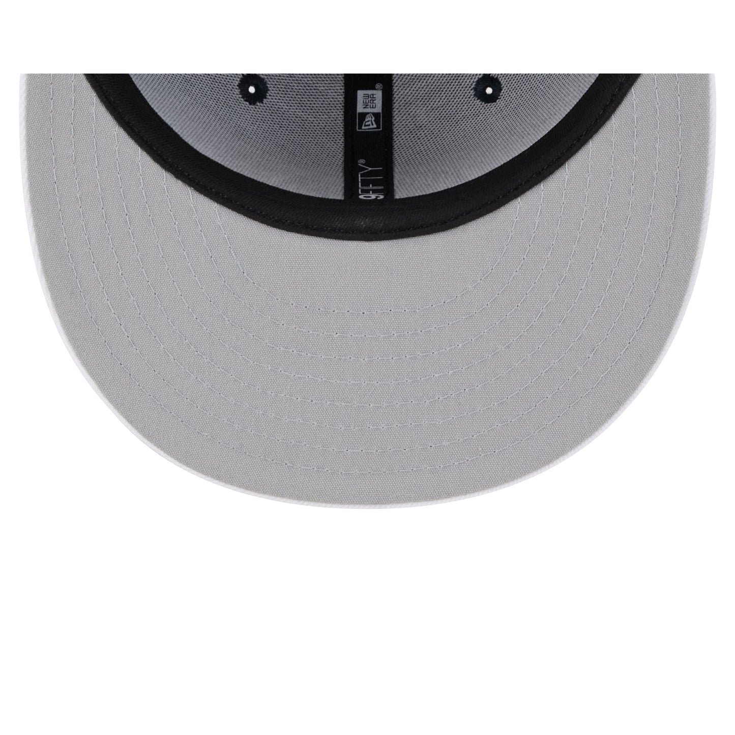 The New York Yankees 2025 Batting Practice 9FIFTY Snapback features an embroidered Yankees logo at the front panels with a matching snapback closure at the rear. Additional details include a pivot knit fabrication, a white visor, and a gray undervisor.