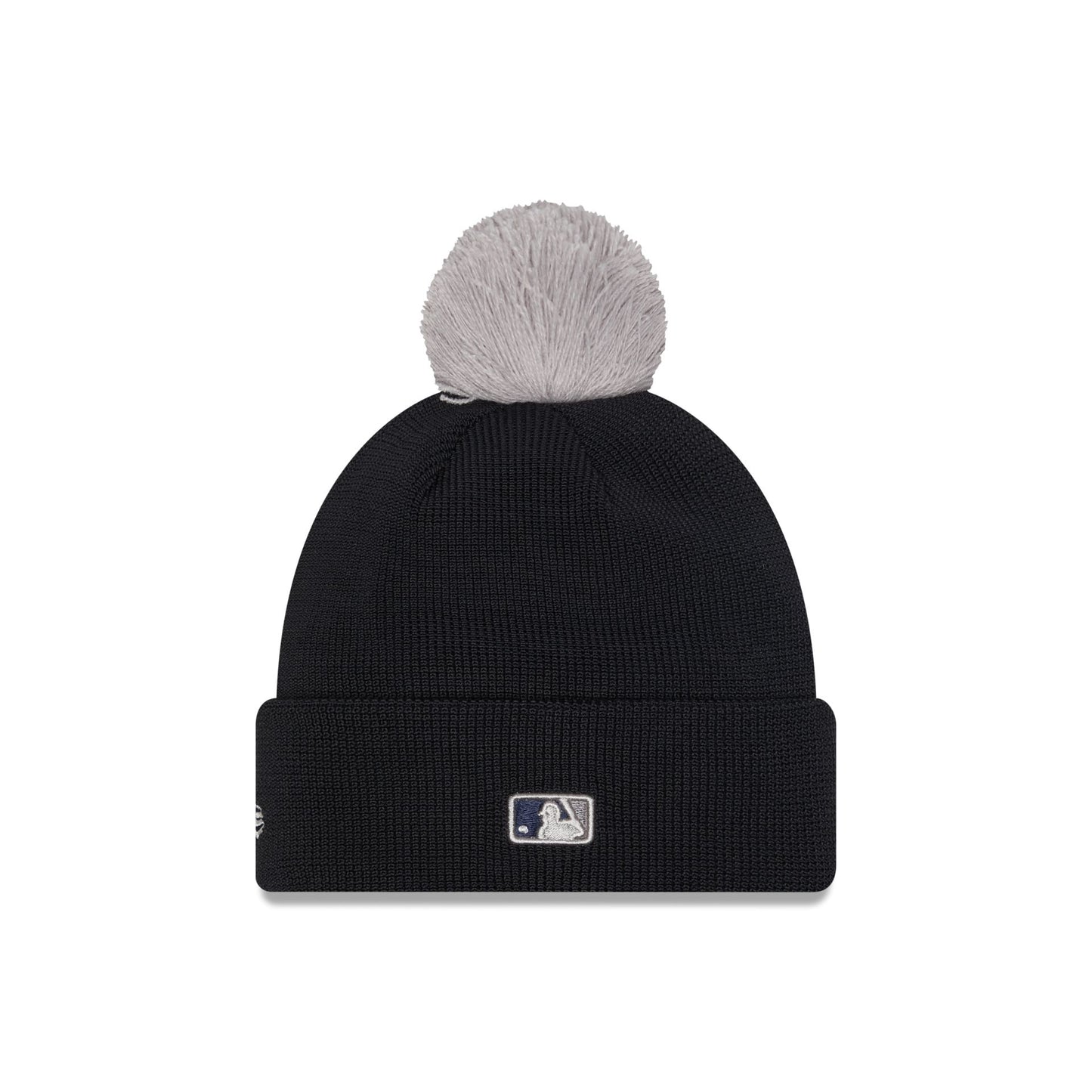 The New York Yankees 2025 Batting Practice Pom Knit Hat features an embroidered Yankees logo at the front cuff with a matching MLB Batterman logo at the rear. Additional details include a one-time removeable pom.