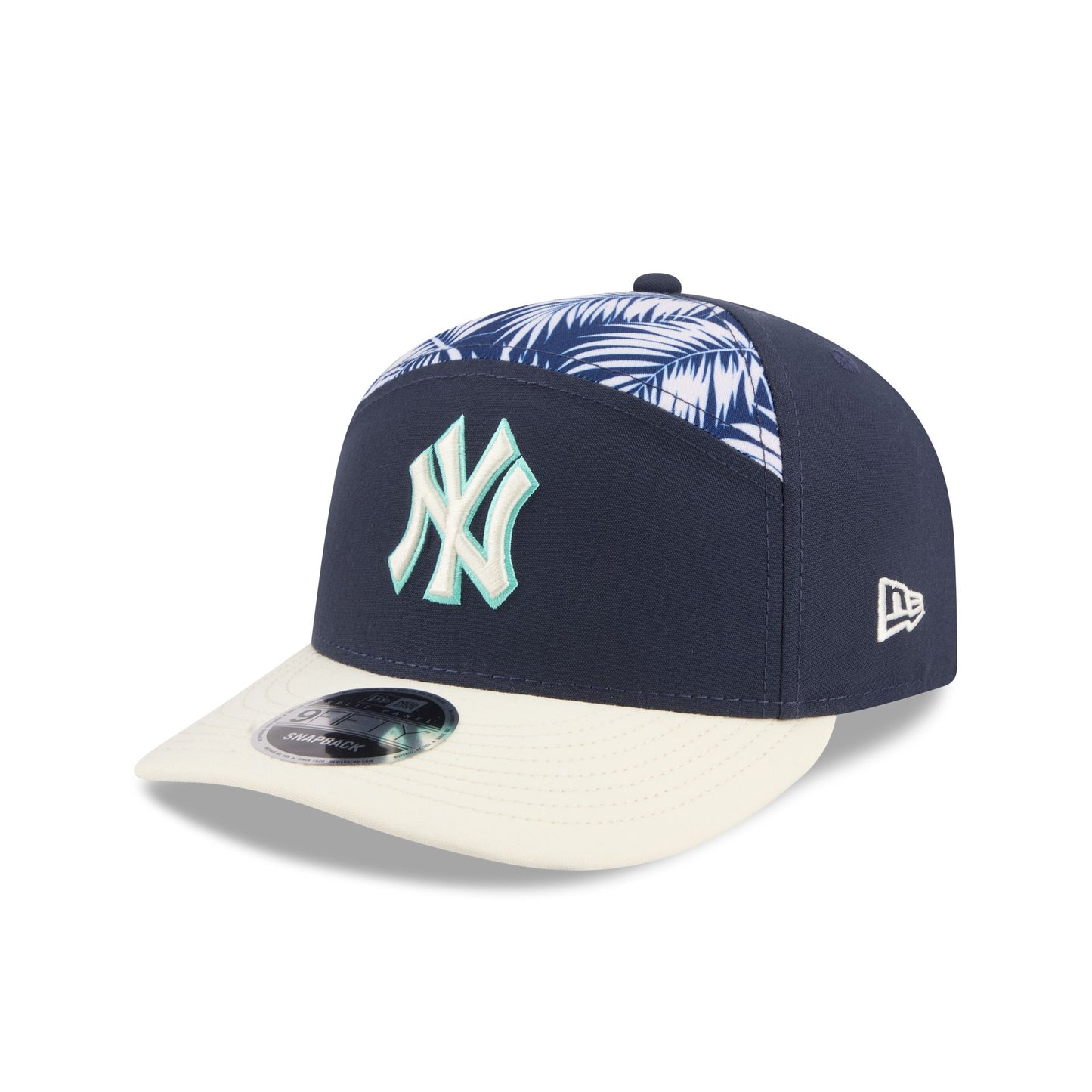 The New York Yankees 2026 Spring Training Grapefruit League Split Panel 9FIFTY Snapback features an embroidered Yankees logo at the front panels against a split-crown construction and a Spring Training patch at the right-wear side. Additional details include a print at the top of the crown and undervisor with an adjustable snapback closure at the rear.