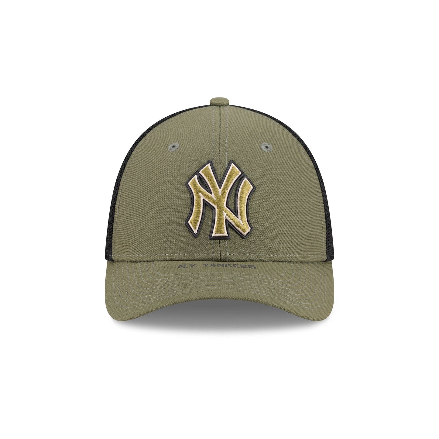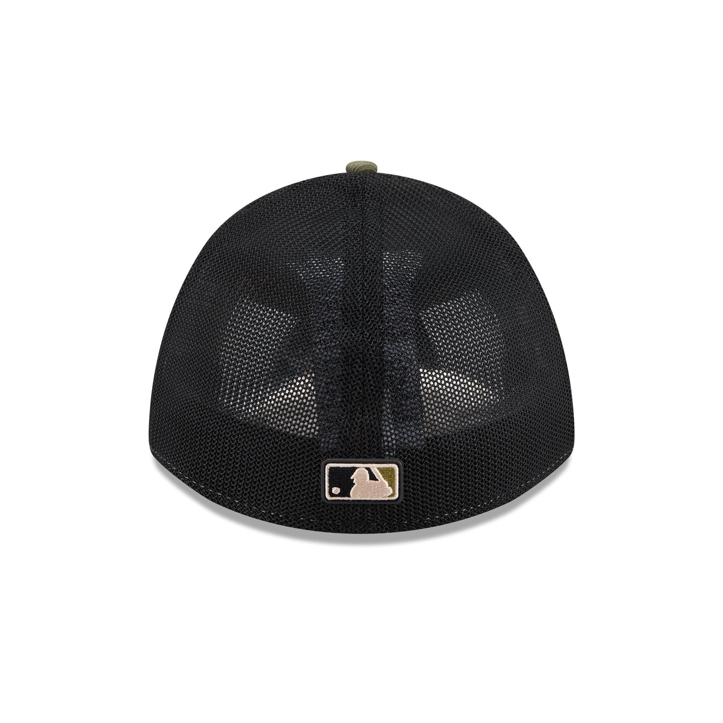 The New York Yankees Armed Forces Day 2026 39THIRTY M-Crown Stretch Fit Cap features an embroidered Yankees patch at the front panels with a matching MLB Batterman logo at the rear mesh panels and a screen-printed team wordmark at the visor. Additional details include a heat sealed silicone USA flag patch at the right-wear side with screen-printed stars at a black undervisor, camo patterned interior panels, and an Armed Forces Day wordmark at the interior tape.
