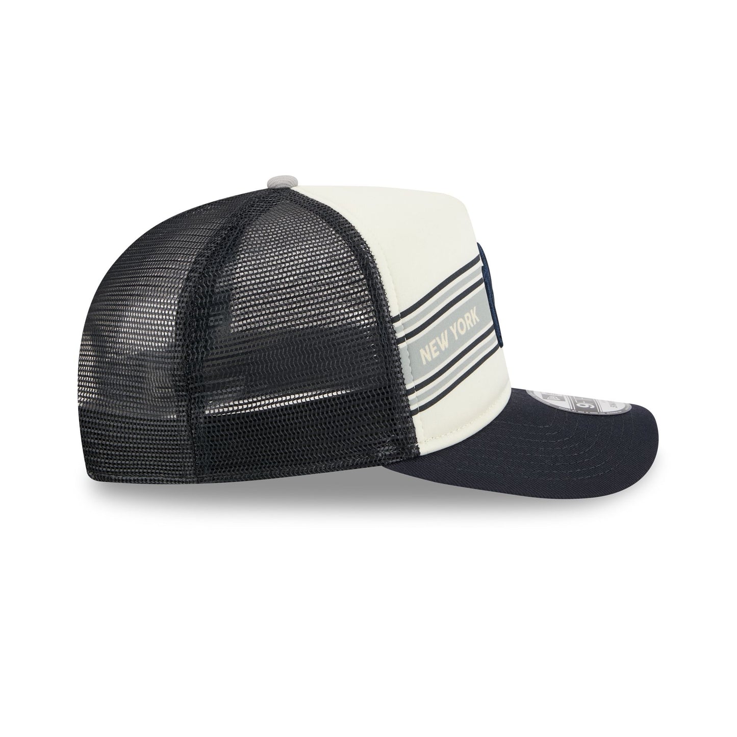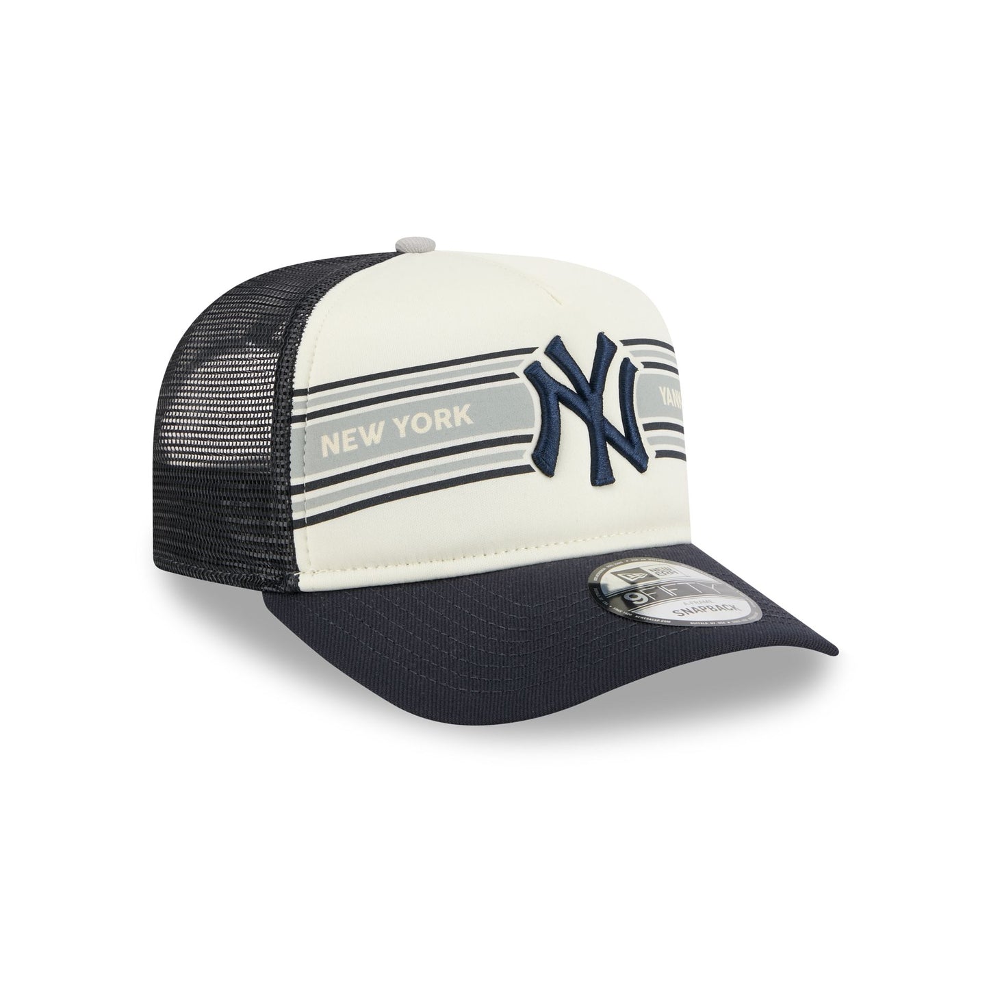 The New York Yankees Banner 9FIFTY A-Frame Trucker features a embroidered Yankees logo at the front panels against a screen-printed stripe at the front panels. Additional details include a snapback closure at a mesh rear and a gray undervisor.