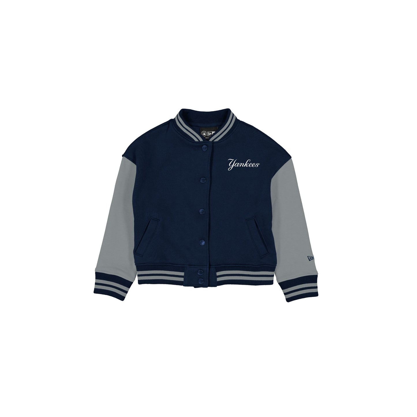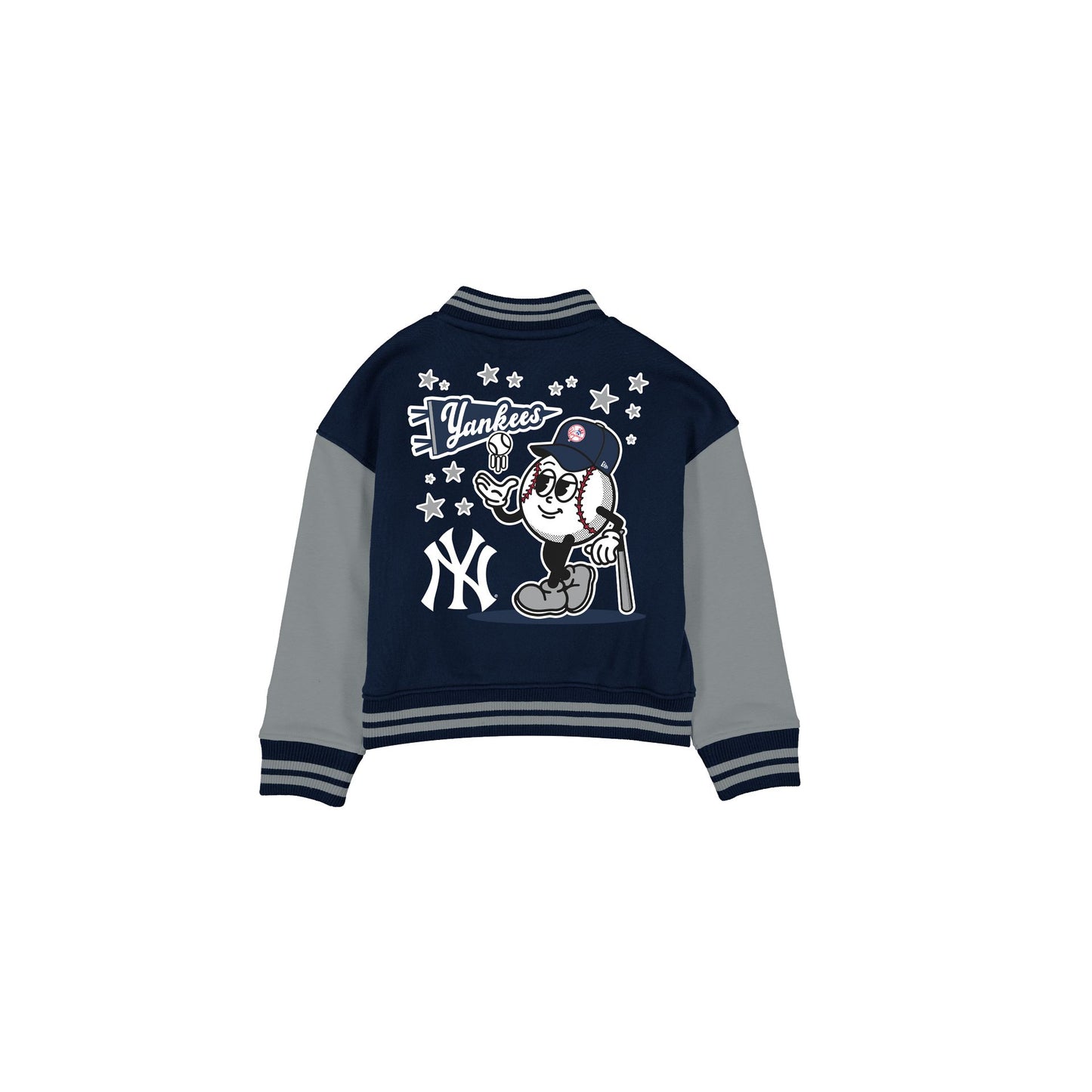 The New York Yankees Baseball Girls Jacket features a screen-printed Yankees logo at the left chest with a baseball girl graphic at the rear. Additional details include a snap button closure and front pockets.