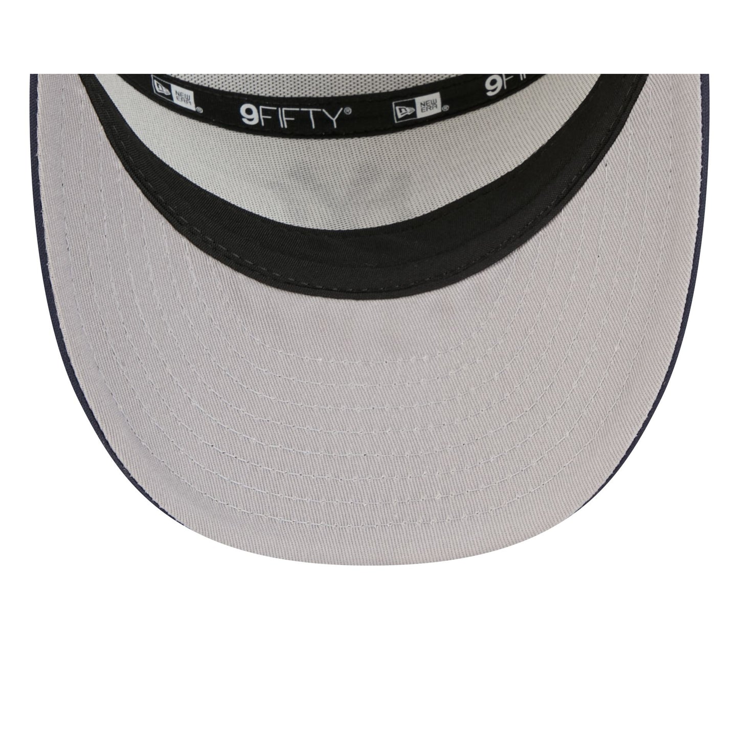 The New York Yankees Blocked Split Panel 9FIFTY Trucker features an embroidered Yankees logo at the front panel with a split-crown construction. Additional details include an adjustable snapback closure at a mesh rear and a gray undervisor.