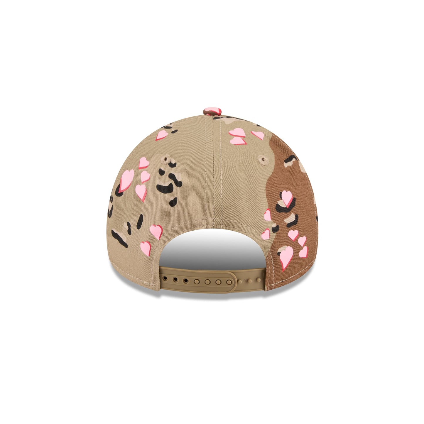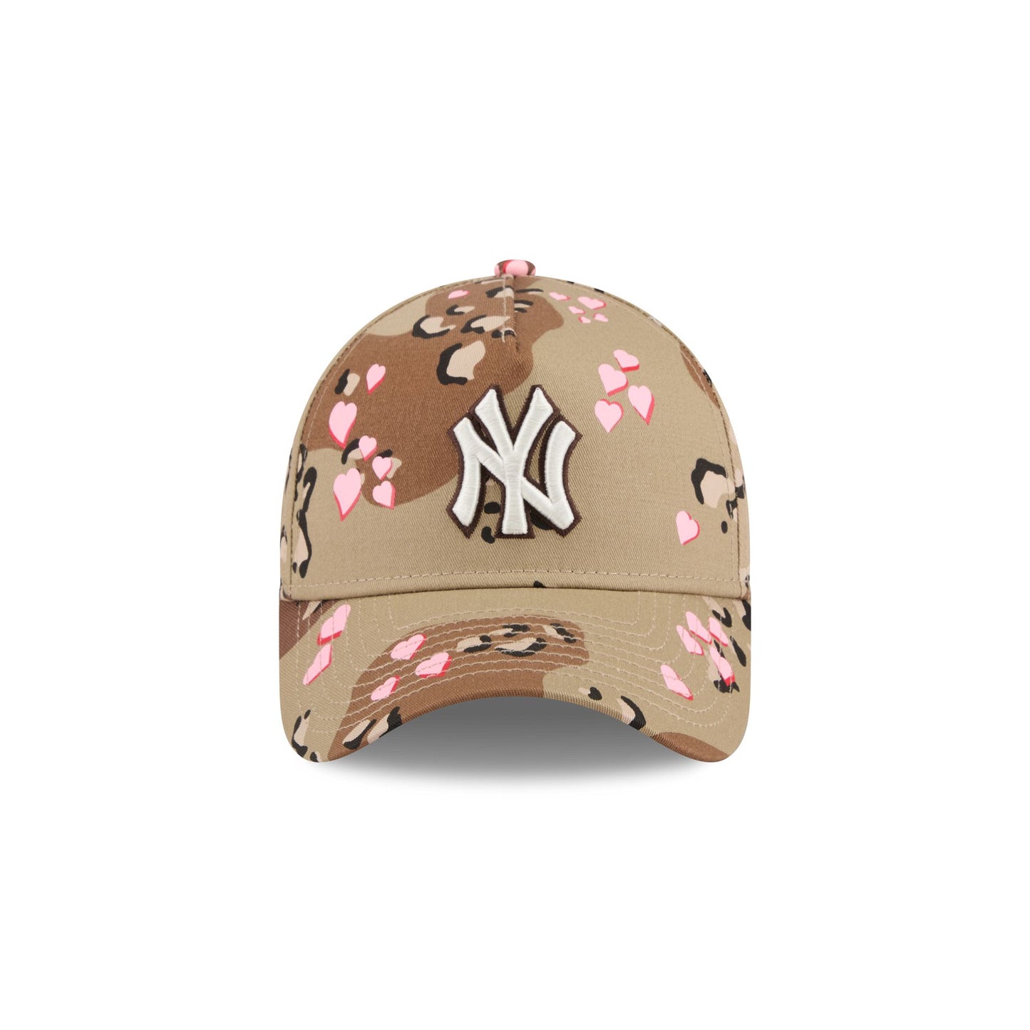 The New York Yankees Camo Hearts 9FORTY A-Frame Snapback features an embroidered Yankees logo at the front panels against a camo and heart print pattern throughout. Additional details include an adjustable snapback closure at the rear and a pink undervisor.