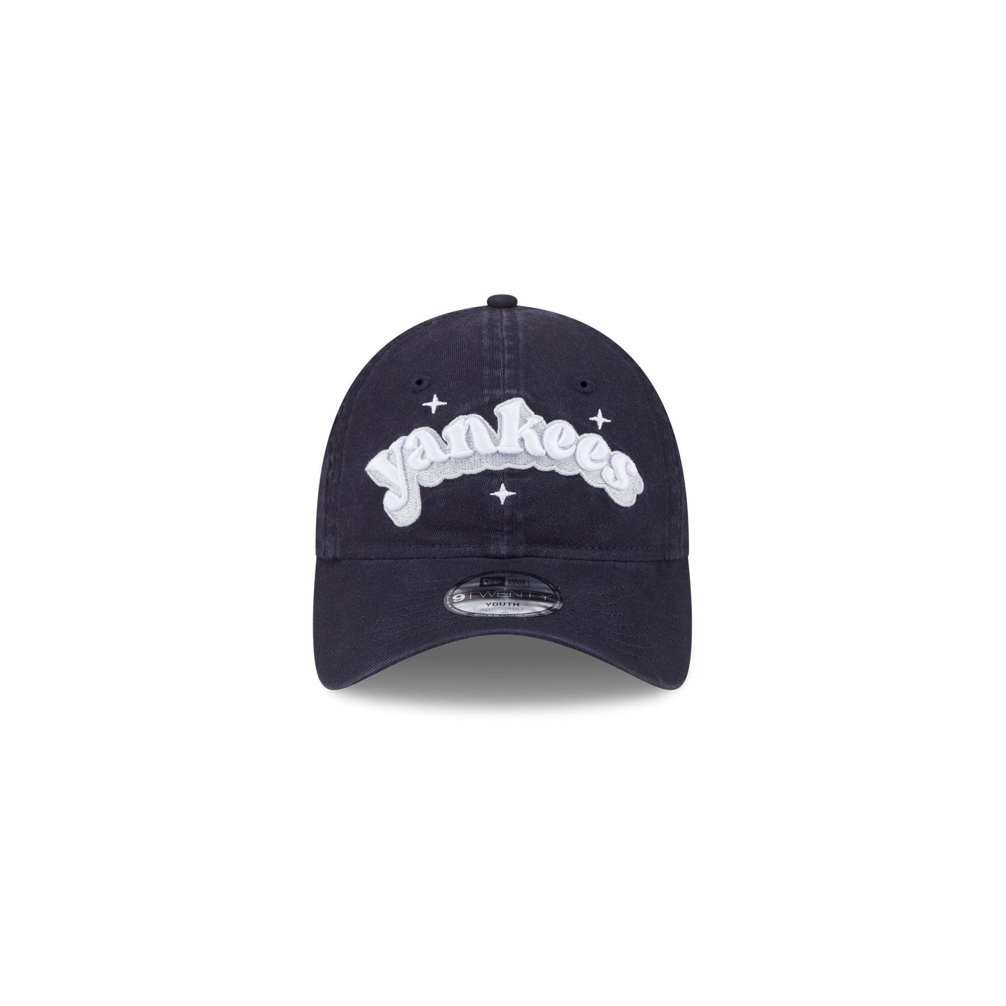 The New York Yankees Cheer Kids 9TWENTY Adjustable Cap features an embroidered New York Yankees sparkle wordmark at the front panels. Additional details include a logo at the right-wear side and an adjustable D-Ring closure at the rear and a gray undervisor.