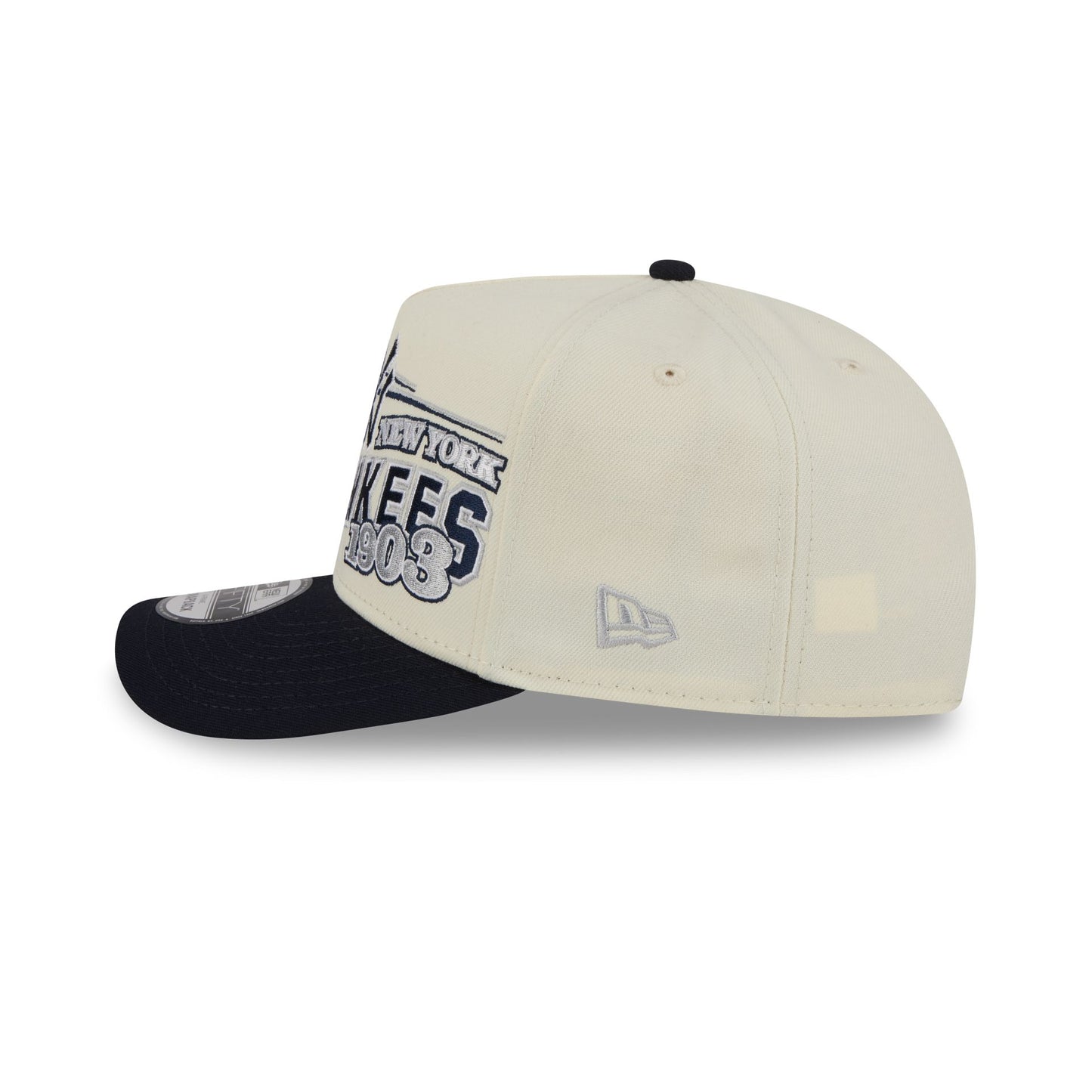 The New York Yankees Chrome White Classic 9FIFTY A-Frame Snapback features an embroidered Yankees graphic at the front panels with an adjustable snapback closure at the rear and a green undervisor.
