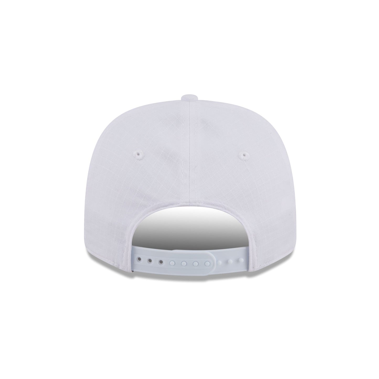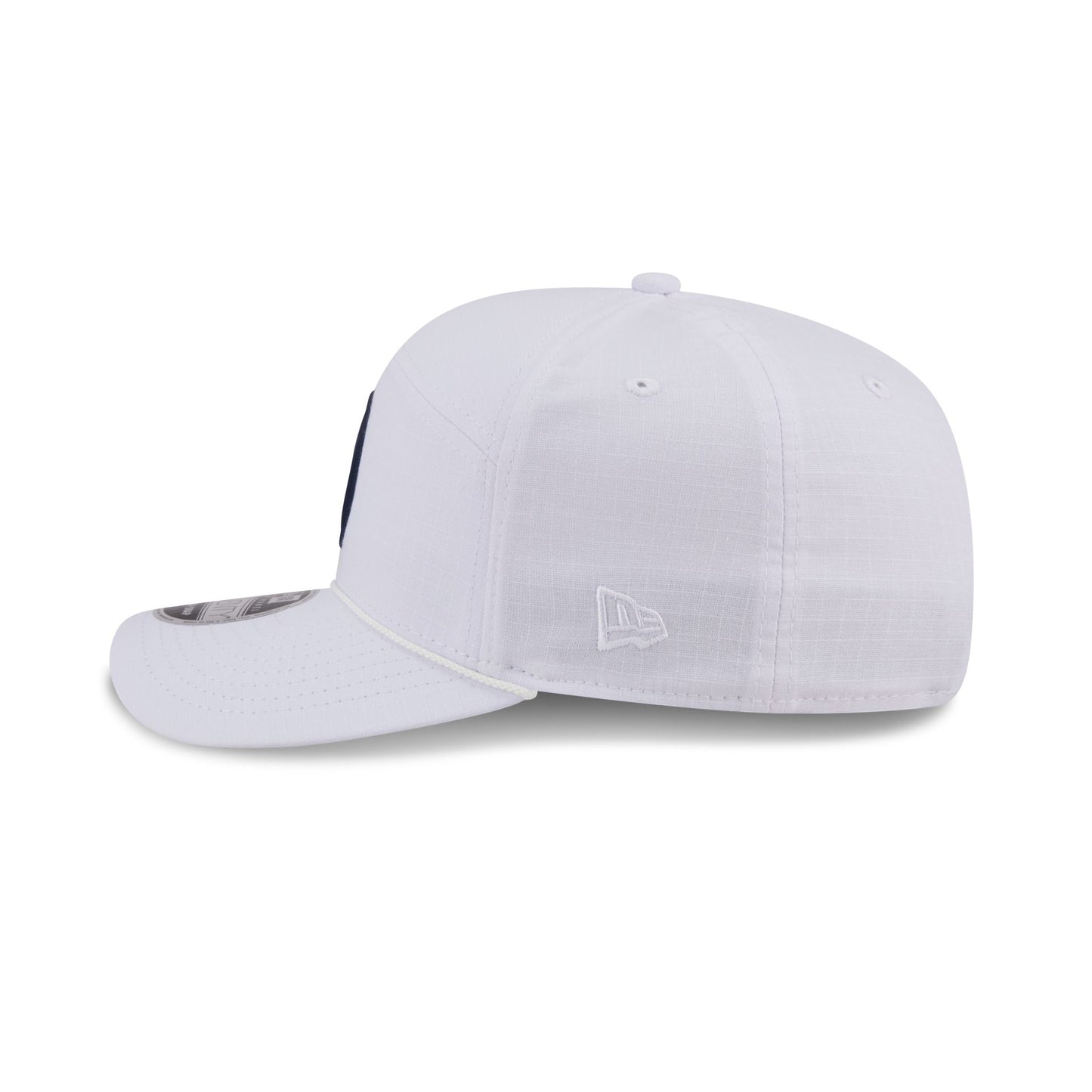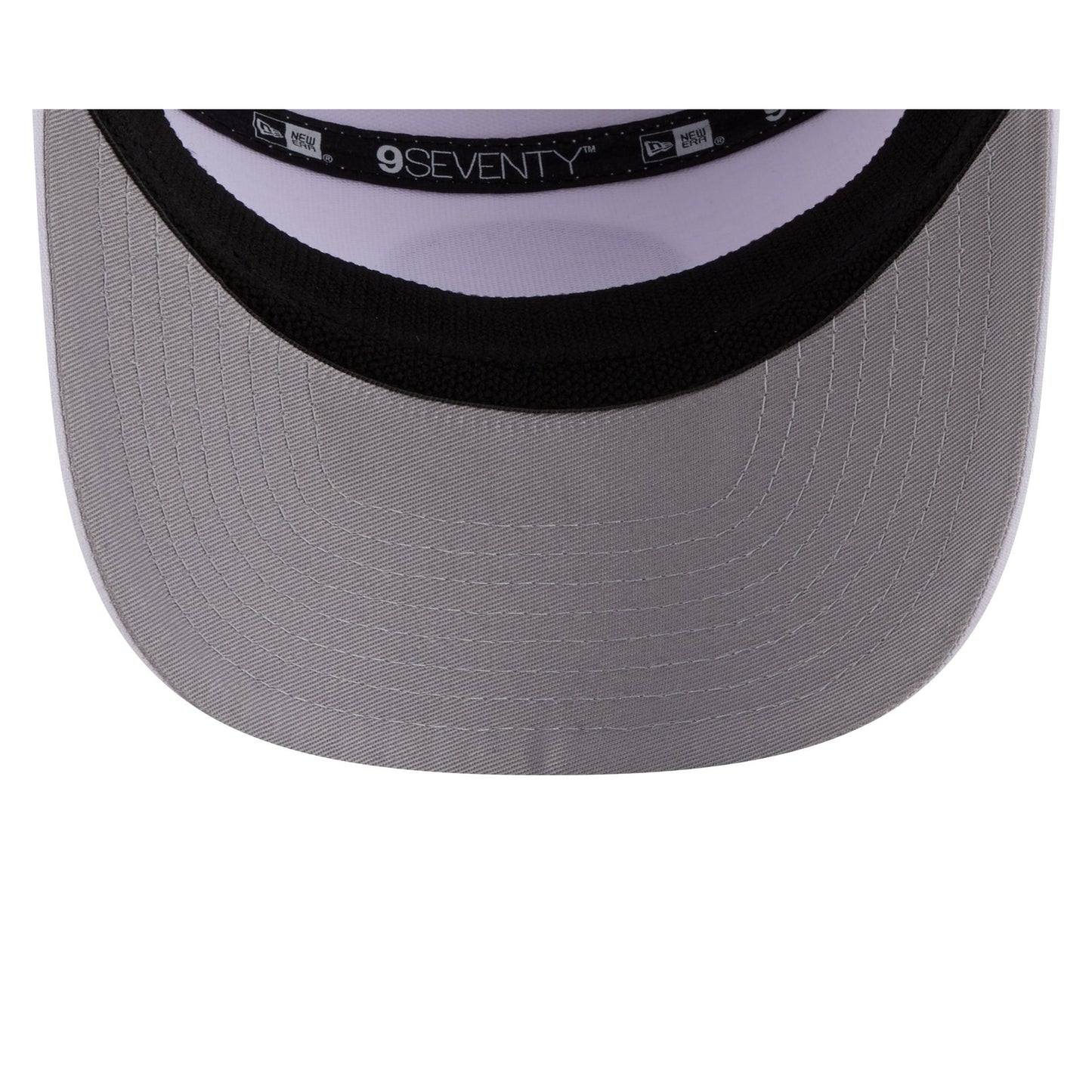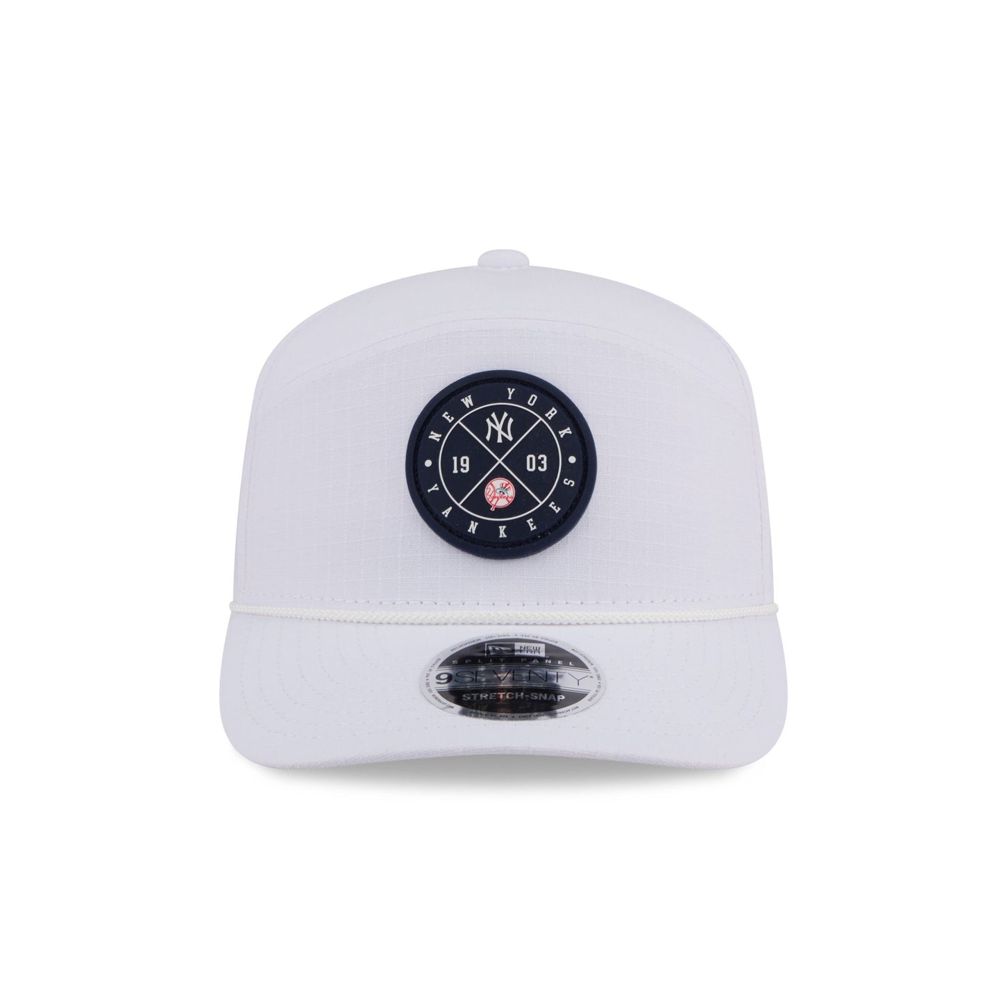The New York Yankees Circle Logo White Split Panel 9SEVENTY Stretch-Snap features a woven silicone Yankees circle logo at the front panel with a split crown construction and light-weight fabrication. Additional details include an adjustable stretch-snap closure at the rear and a gray undervisor.
