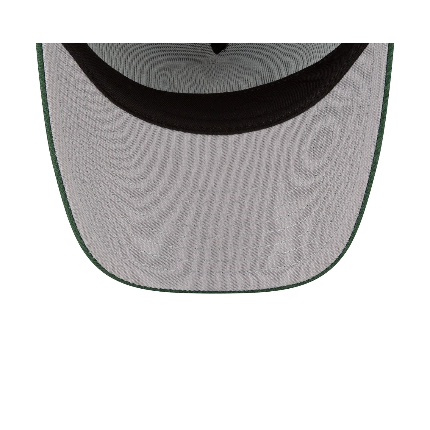 The New York Yankees Color Flip Green 9FORTY A-Frame Snapback features an embroidered Yankees logo at the front panels with a snapback closure at the rear. Additional details include a 1949 World Series patch at the right-wear side and a gray undervisor.